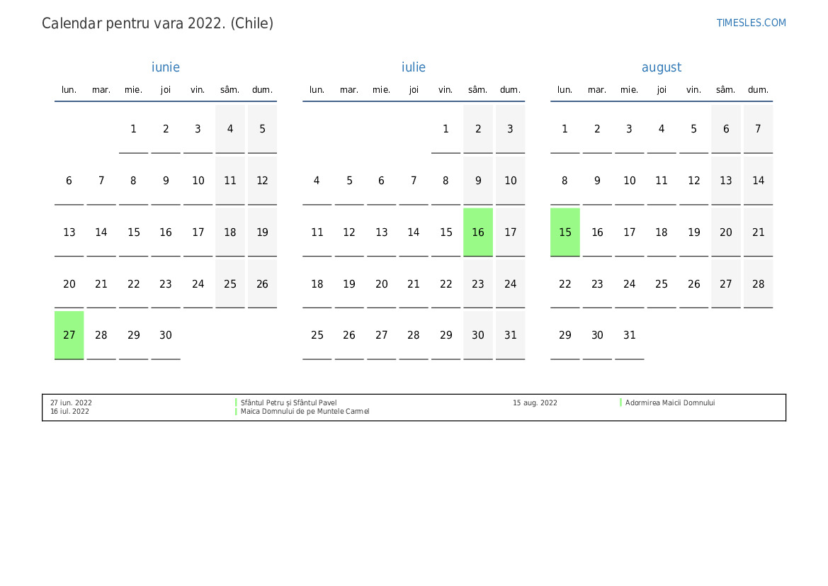 Calendarul sărbătorilor și weekendurilor pentru vara anului 2022 pentru Chile