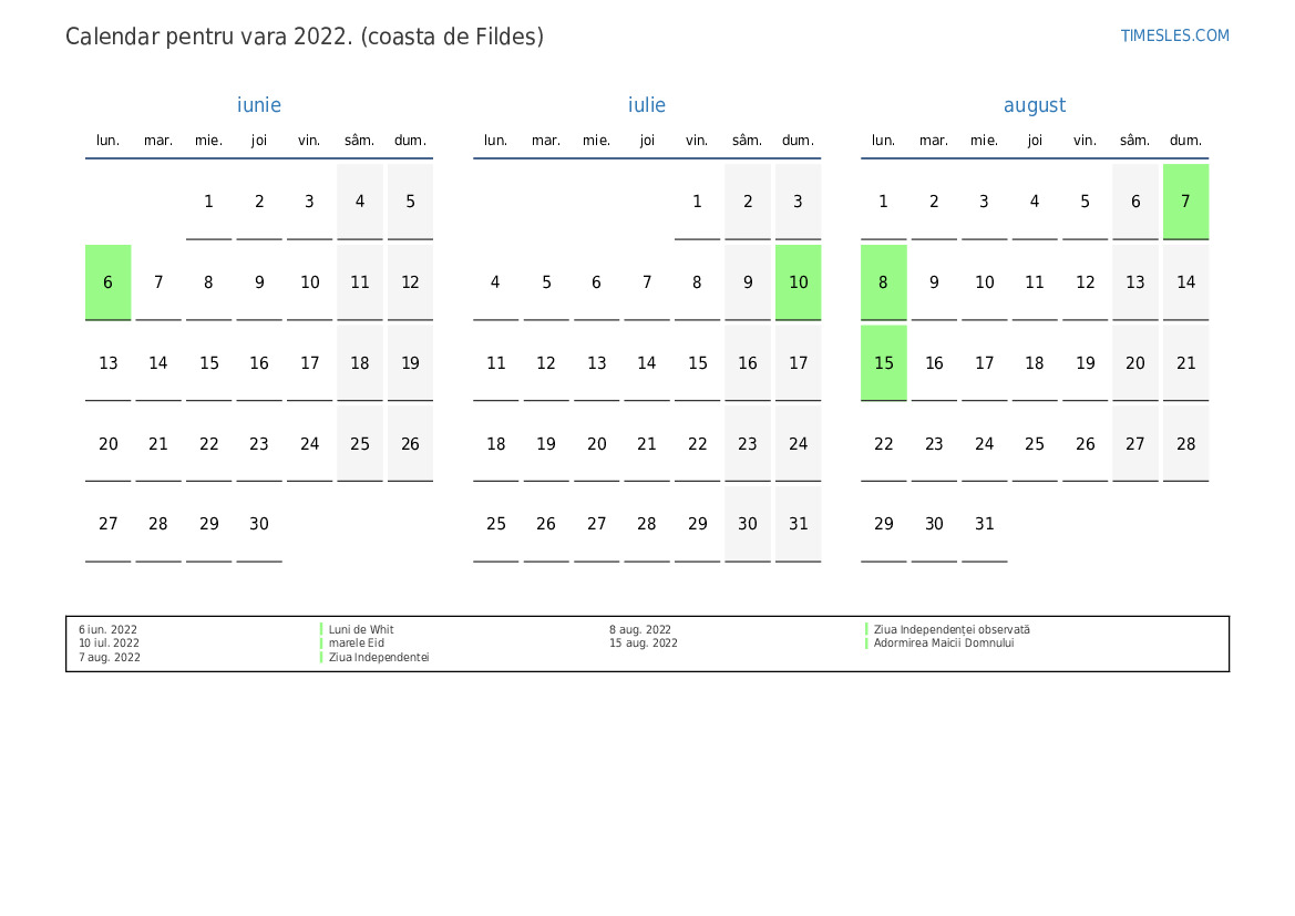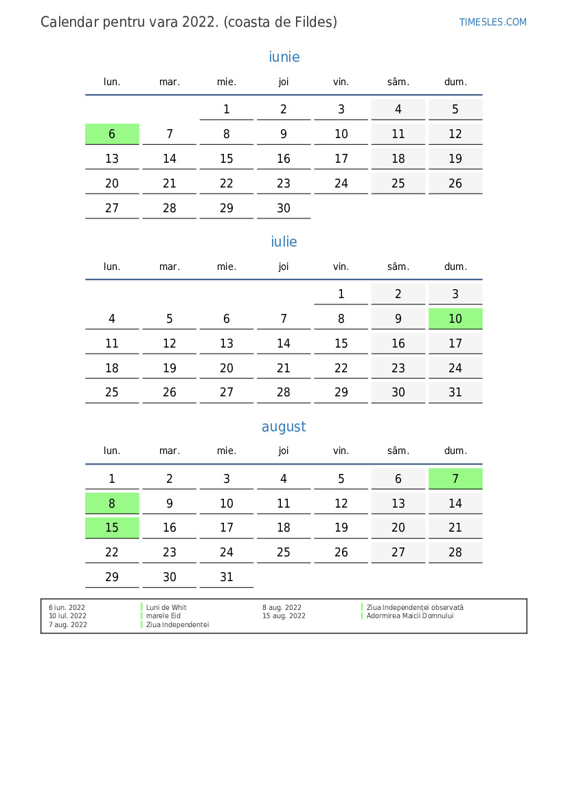 Descărcați și tipăriți calendarul PDF cu sărbătorile și weekendurile pentru vara anului 2022 pentru Coasta de Fildeș