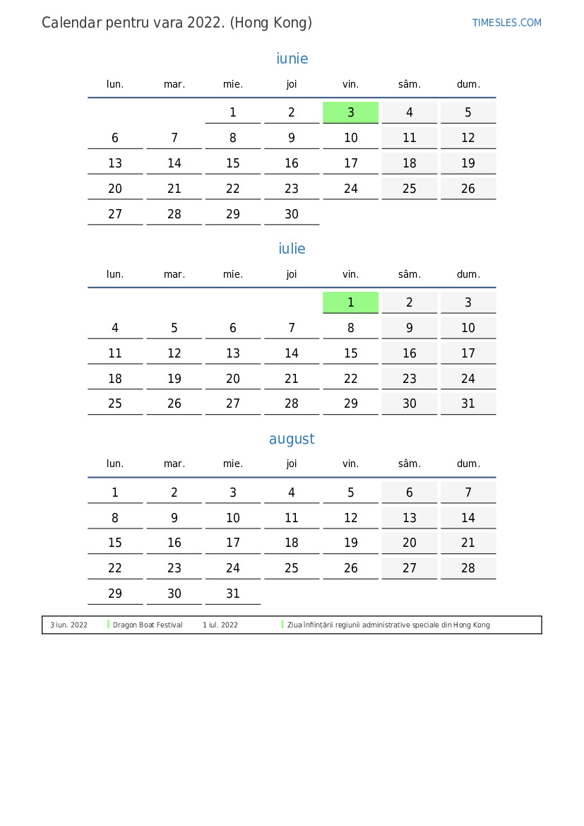 Calendar pentru vara 2022 pentru Hong Kong