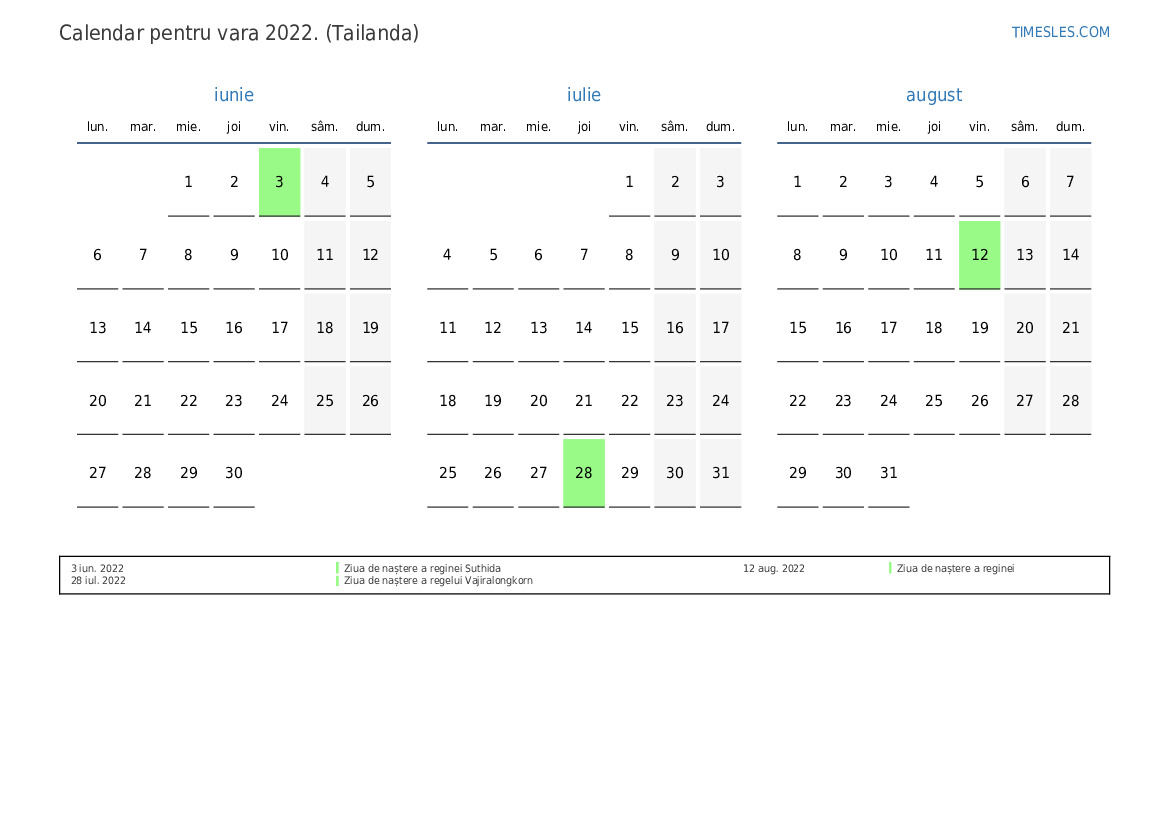Descărcați și tipăriți calendarul PDF cu sărbătorile și weekendurile pentru vara anului 2022 pentru Thailanda