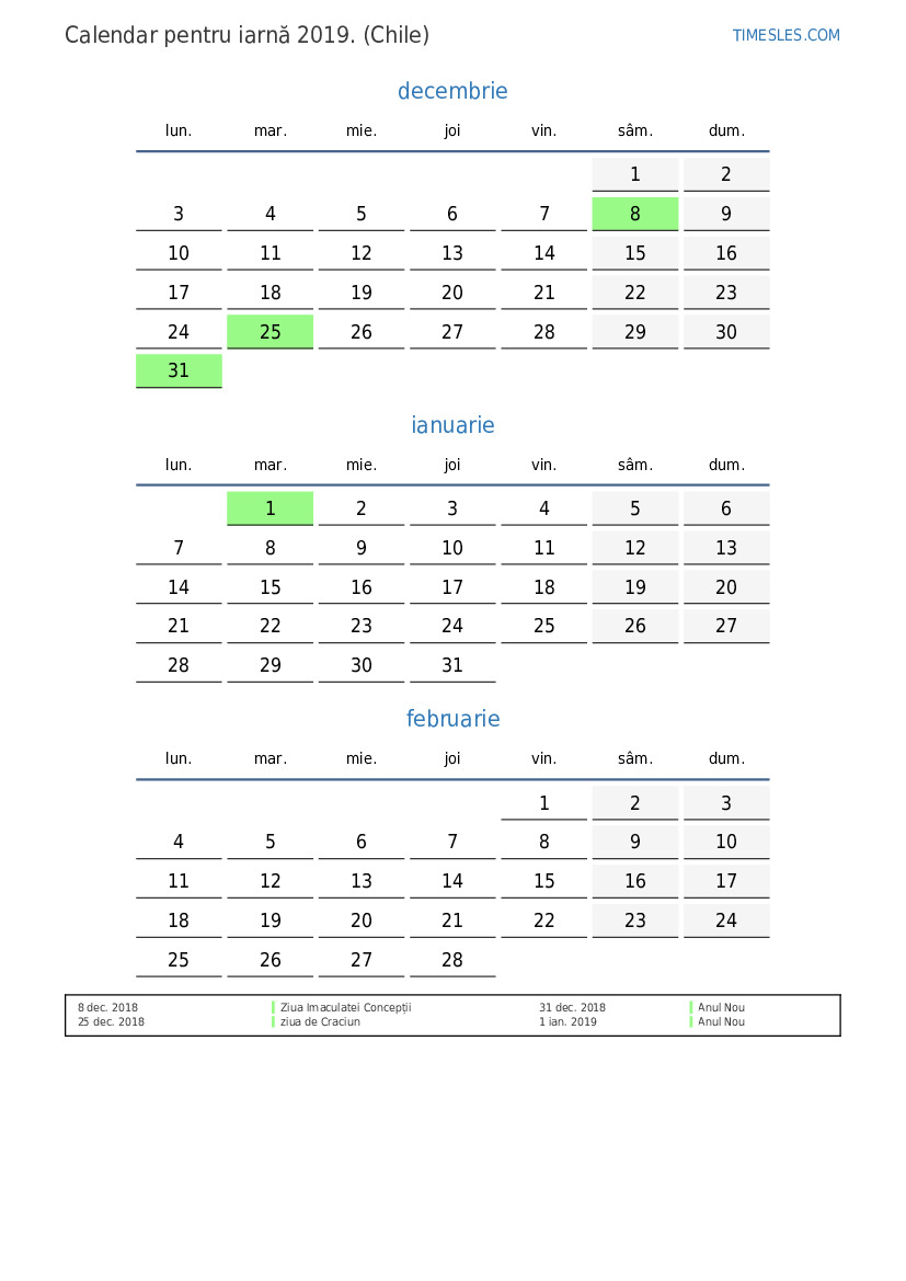 Descărcați și tipăriți calendarul PDF cu sărbătorile și weekendurile pentru iarnă anului 2019 pentru Chile