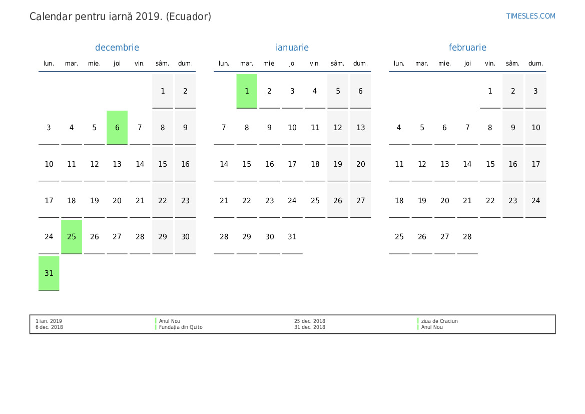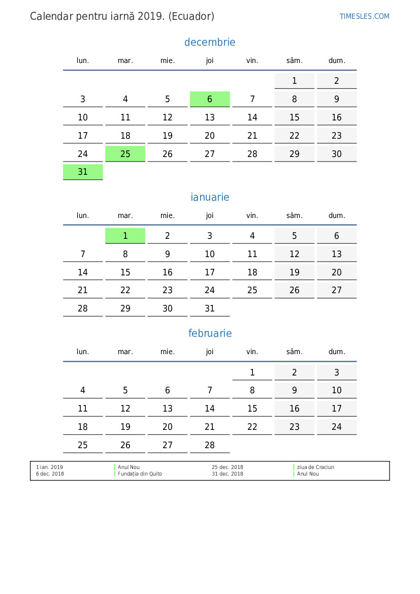 Descărcați și tipăriți calendarul PDF cu sărbătorile și weekendurile pentru iarnă anului 2019 pentru Ecuador