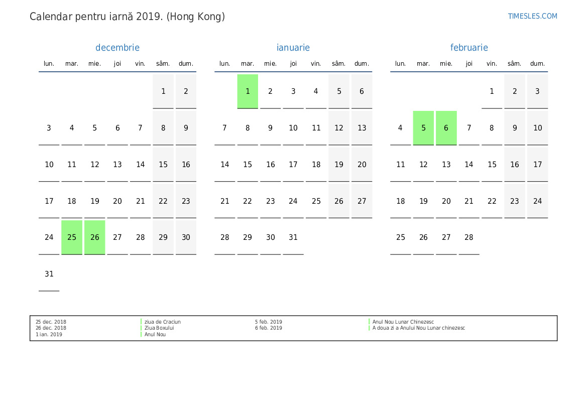 Descărcați și tipăriți calendarul PDF cu sărbătorile și weekendurile pentru iarnă anului 2019 pentru Hong Kong