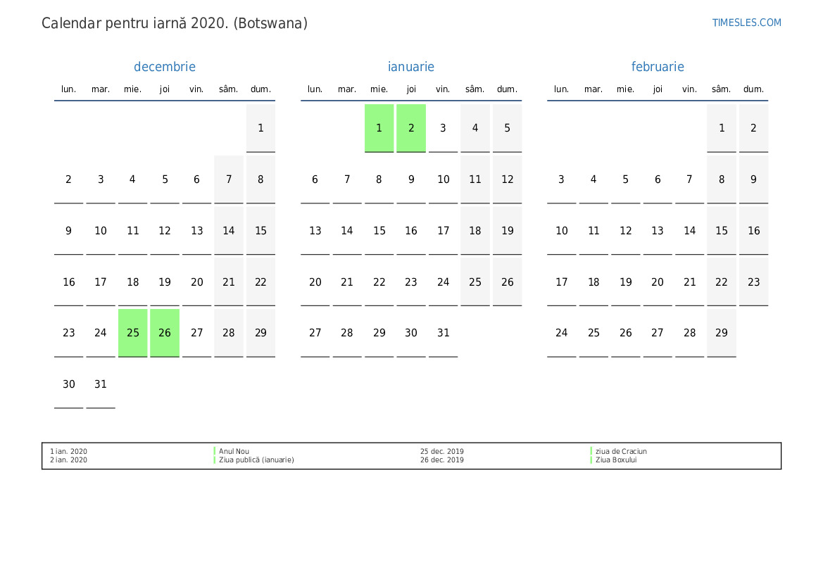 Descărcați și tipăriți calendarul PDF cu sărbătorile și weekendurile pentru iarnă anului 2020 pentru Botswana