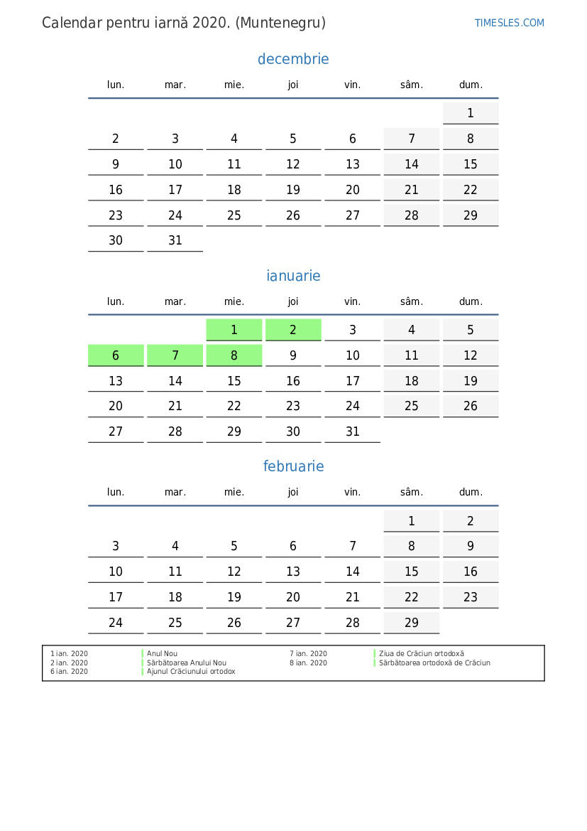 Descărcați și tipăriți calendarul PDF cu sărbătorile și weekendurile pentru iarnă anului 2020 pentru Muntenegru