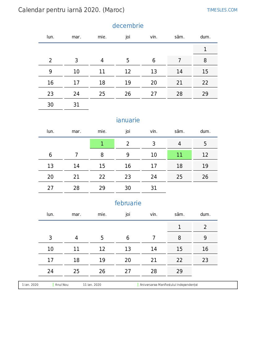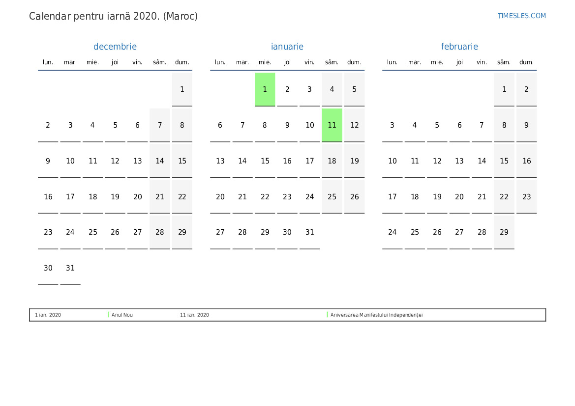 Descărcați și tipăriți calendarul PDF cu sărbătorile și weekendurile pentru iarnă anului 2020 pentru Maroc