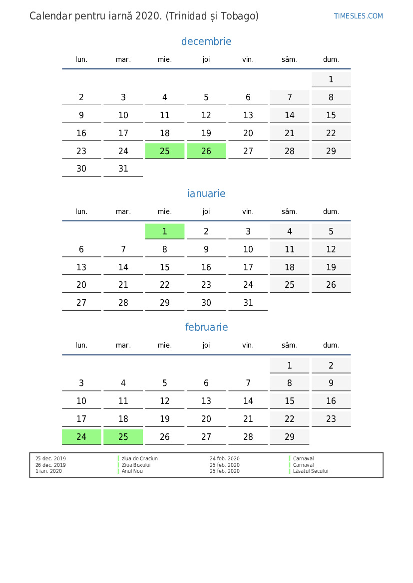 Descărcați și tipăriți calendarul PDF cu sărbătorile și weekendurile pentru iarnă anului 2020 pentru Trinidad și Tobago