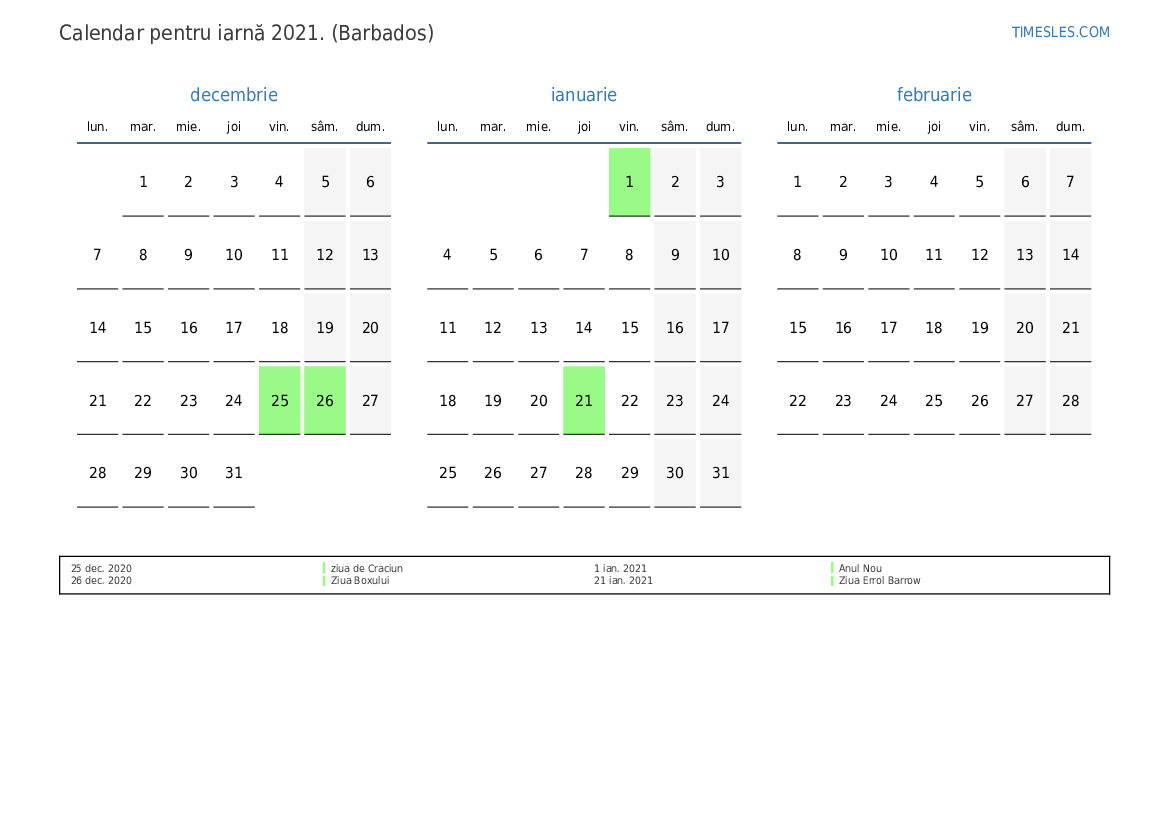 Descărcați și tipăriți calendarul PDF cu sărbătorile și weekendurile pentru iarnă anului 2021 pentru Barbados