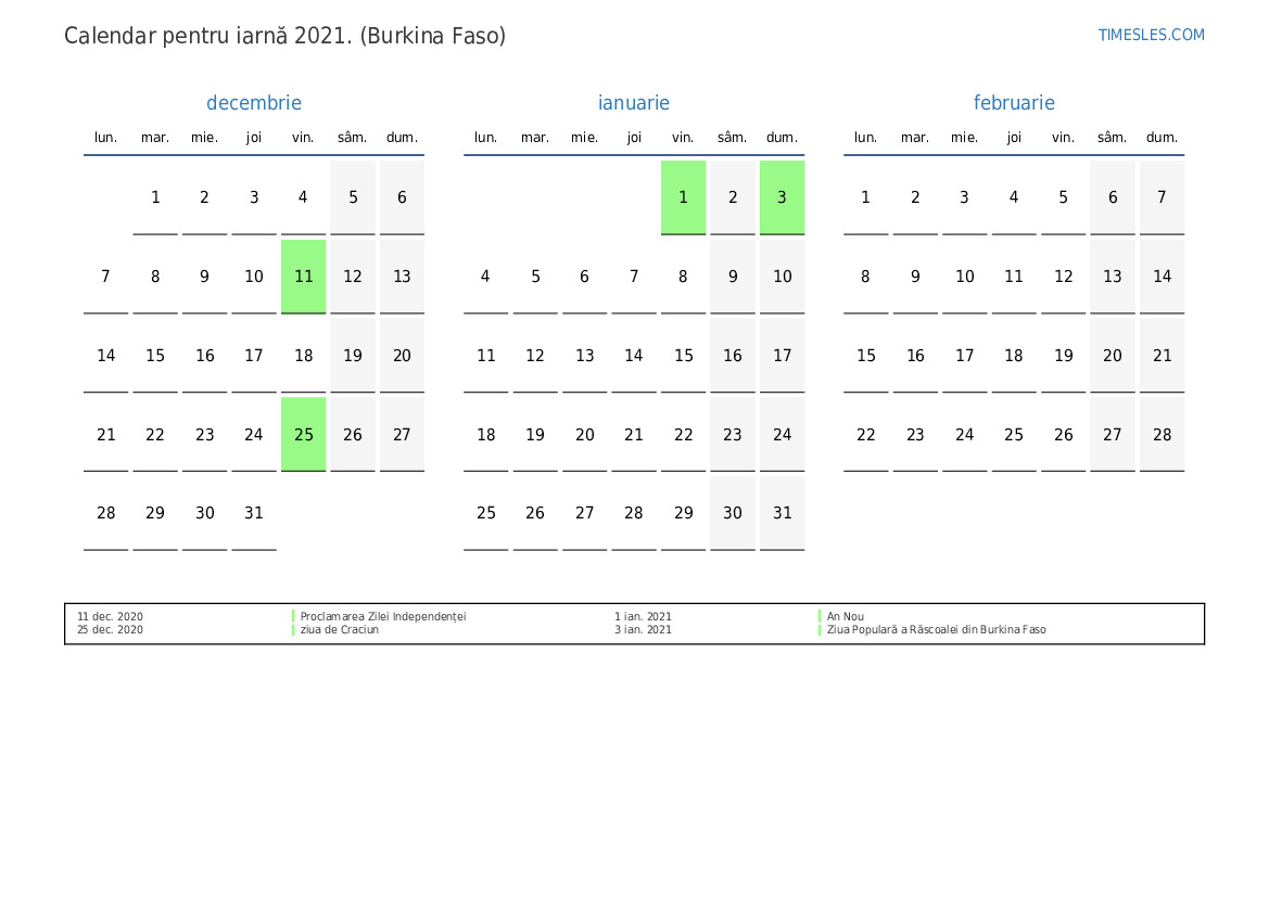 Descărcați și tipăriți calendarul PDF cu sărbătorile și weekendurile pentru iarnă anului 2021 pentru Burkina Faso
