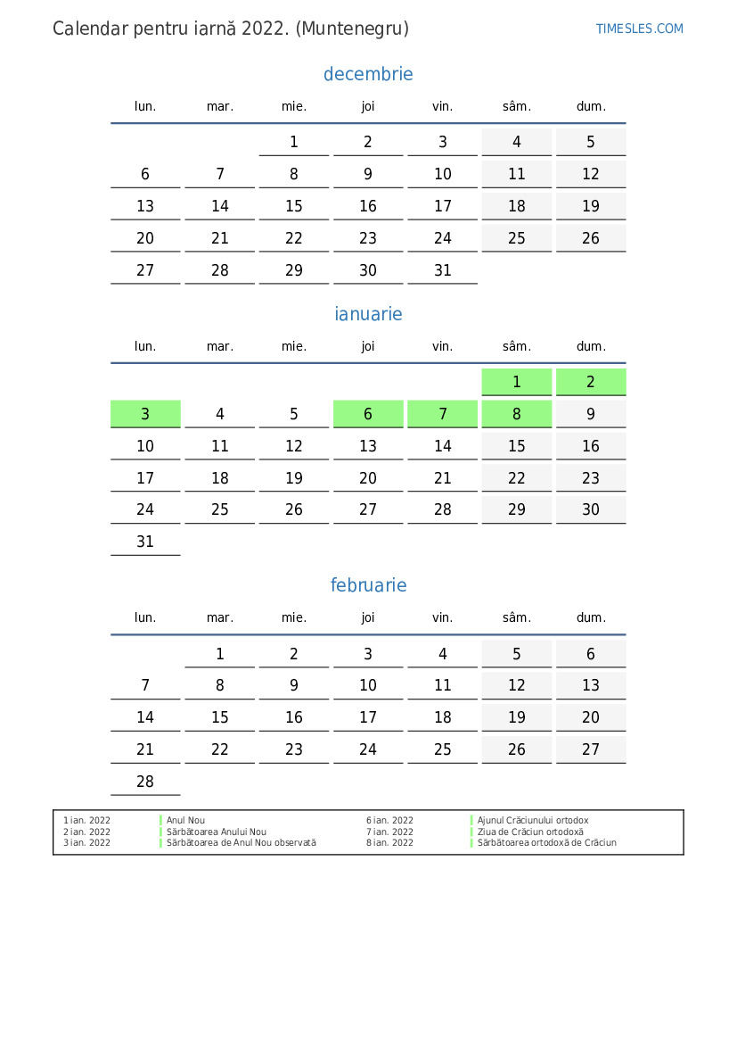 Calendar pentru iarnă 2022 pentru Muntenegru