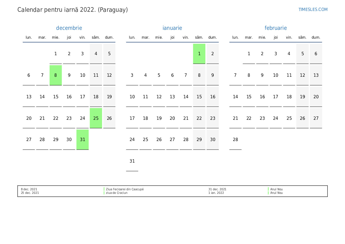 Descărcați și tipăriți calendarul PDF cu sărbătorile și weekendurile pentru iarnă anului 2022 pentru Paraguay