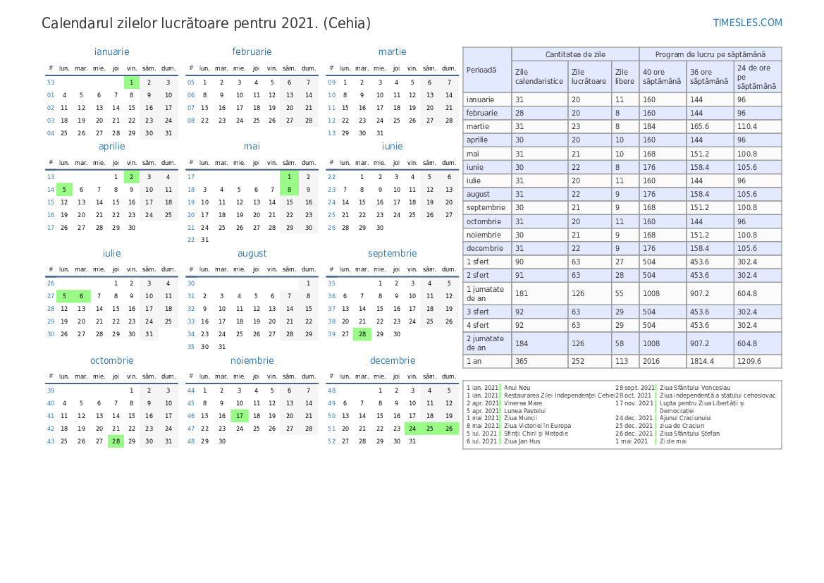 Descărcați și tipăriți calendarul zilelor de lucru PDF pentru noiembrie 2021 pentru Cehia