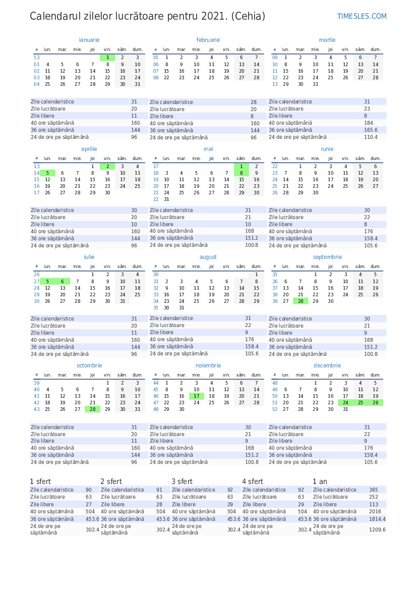 Zile lucrătoare pentru noiembrie 2021 pentru Cehia