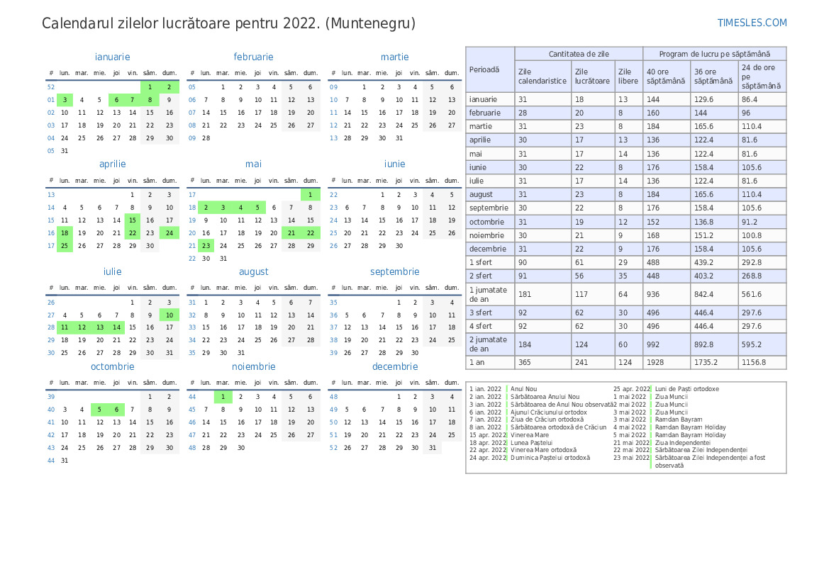 Descărcați și tipăriți calendarul zilelor de lucru PDF pentru februarie 2022 pentru Muntenegru