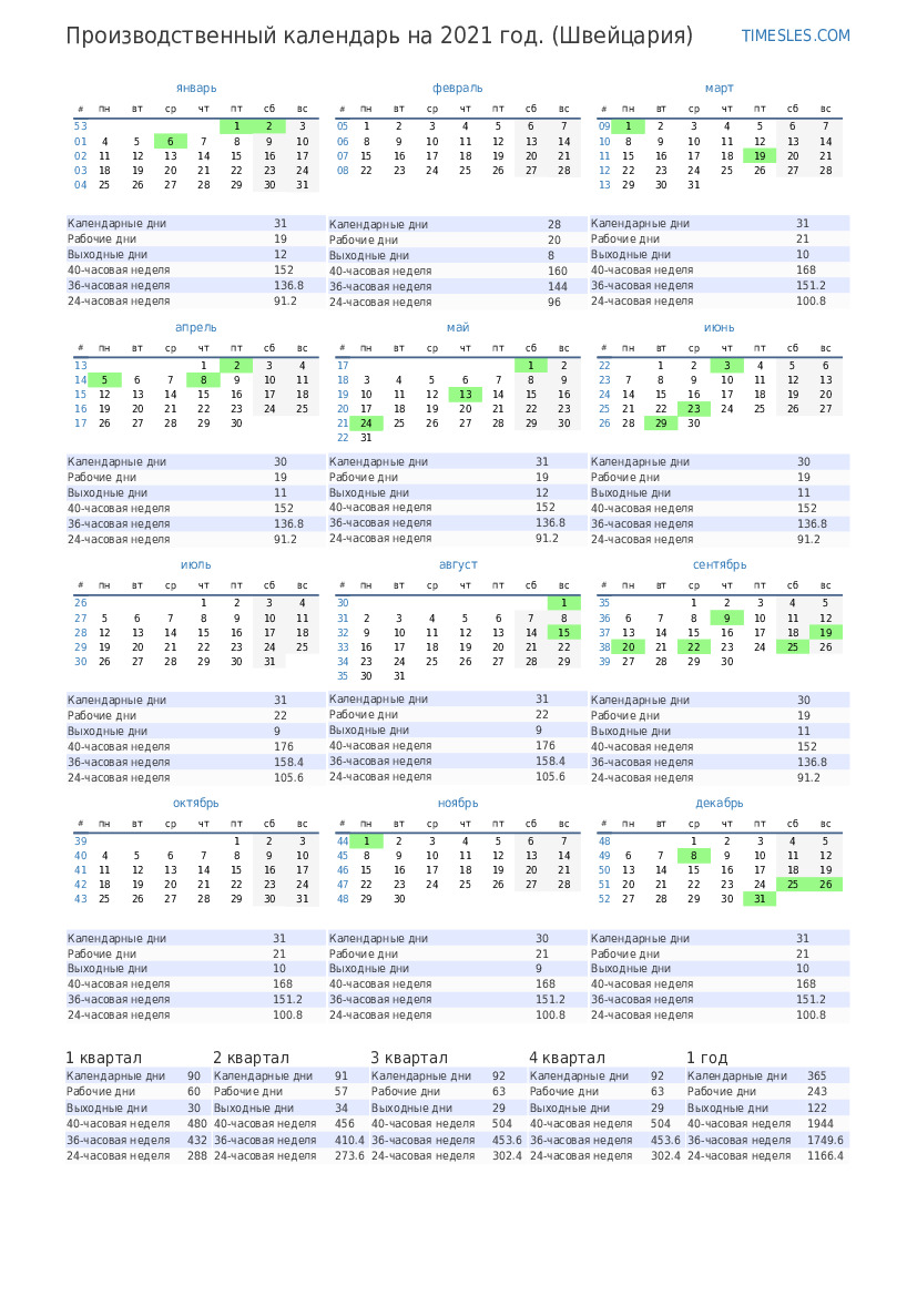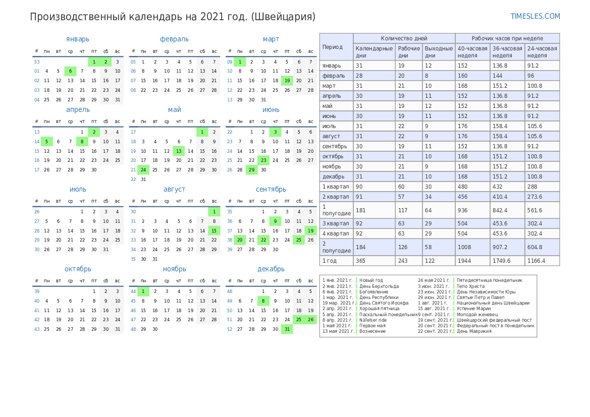 Производственный календарь на февраль 2021 года с неделями. Пятидневная рабочая неделя. На февраль 2021 года в Швейцарии 1 праздничный и выходной день. Календарь с выработкой часов и переносами праздников.