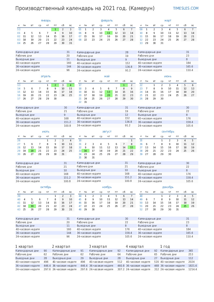 Производственный календарь на август 2021 года с неделями. Пятидневная рабочая неделя. На август 2021 года в Камеруне 2 праздничных и выходных дня. Календарь с выработкой часов и переносами праздников.
