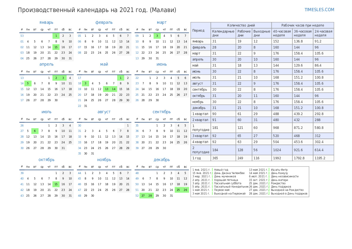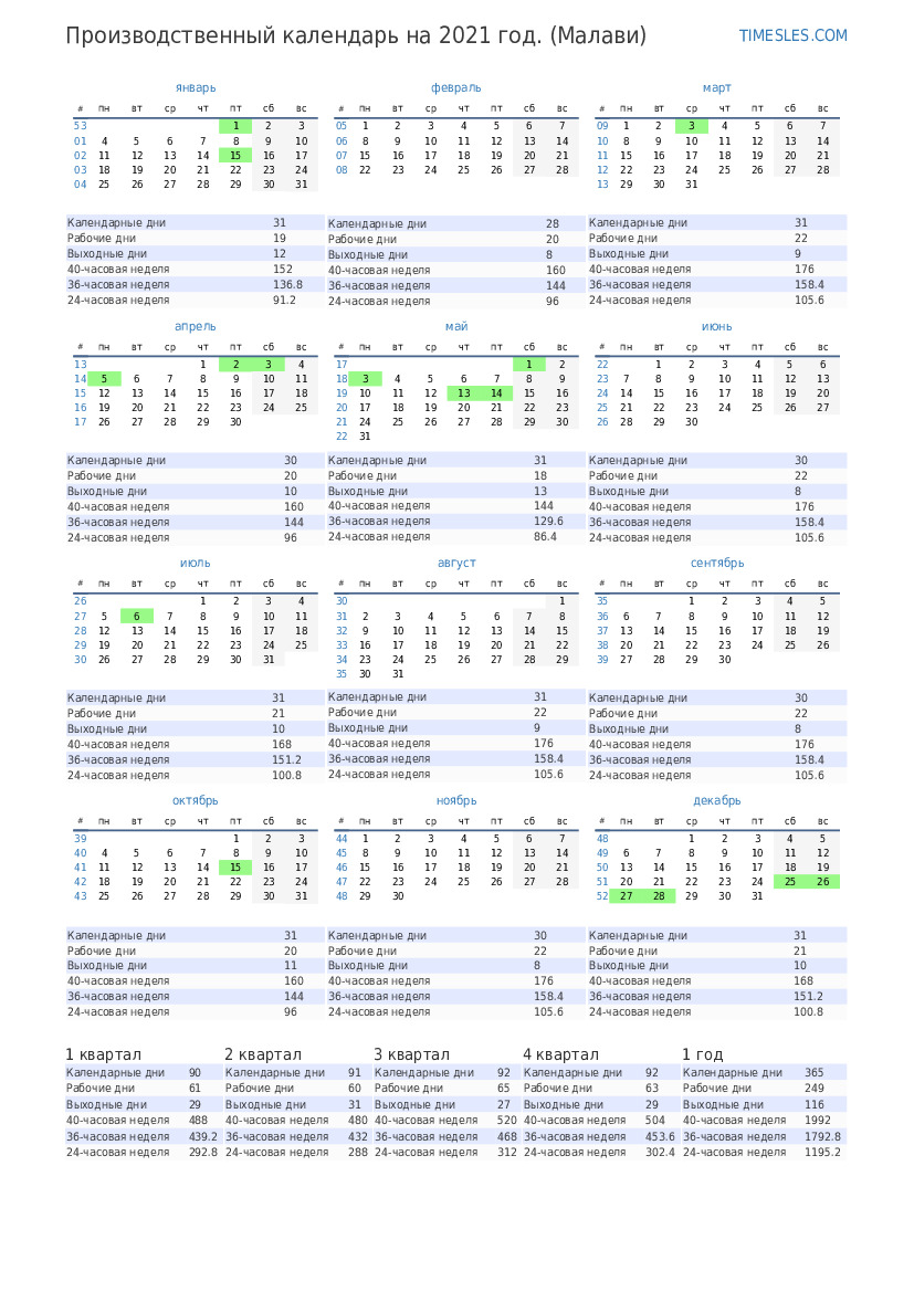 Производственный календарь на август 2021 года с неделями. Пятидневная рабочая неделя. На август 2021 года в Малави 0 праздничных и выходных дней. Календарь с выработкой часов и переносами праздников.