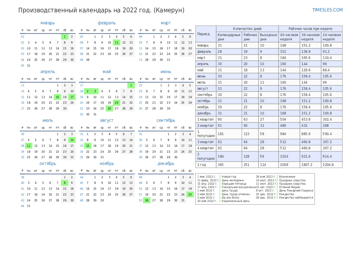 Производственный календарь на июнь 2022 года для Камеруна