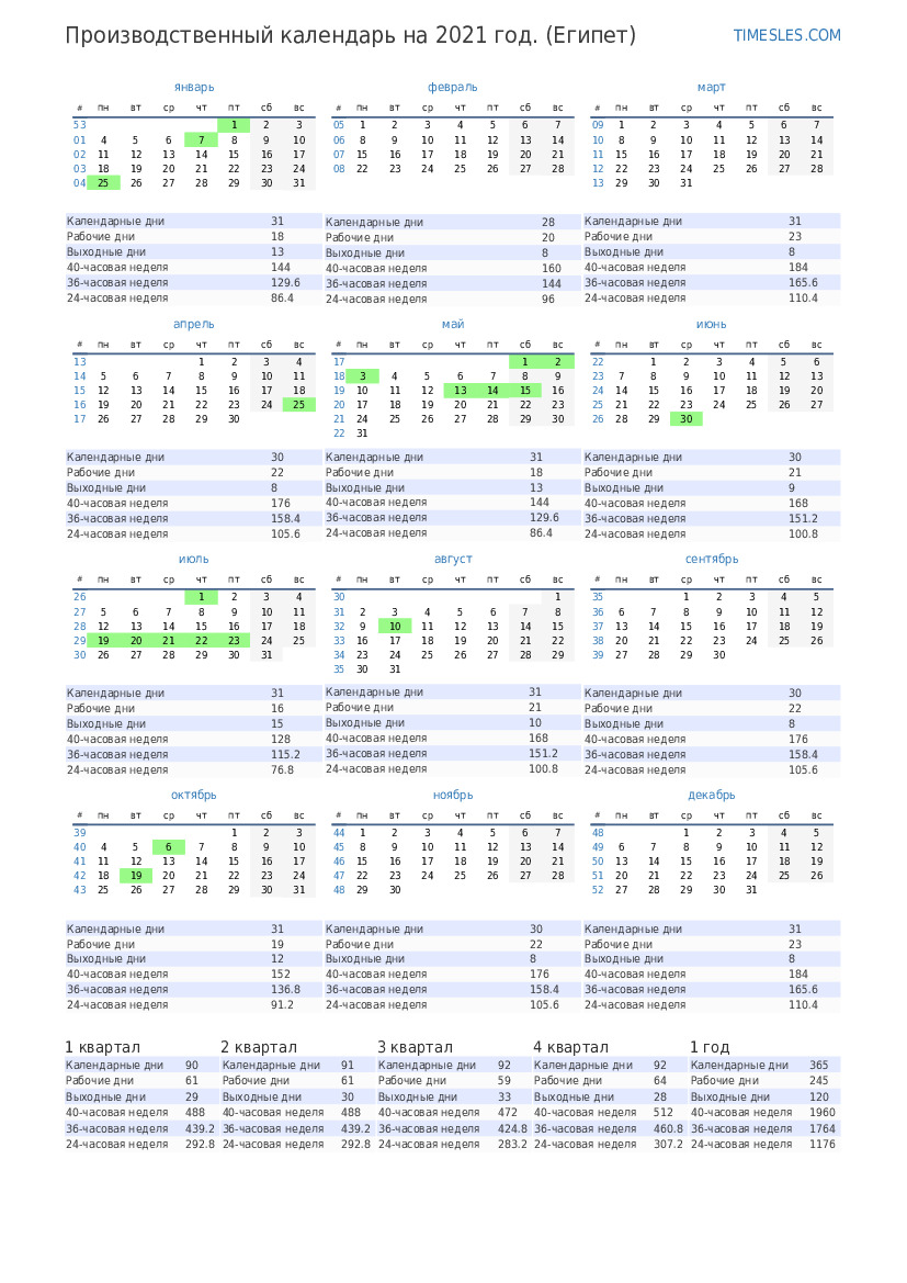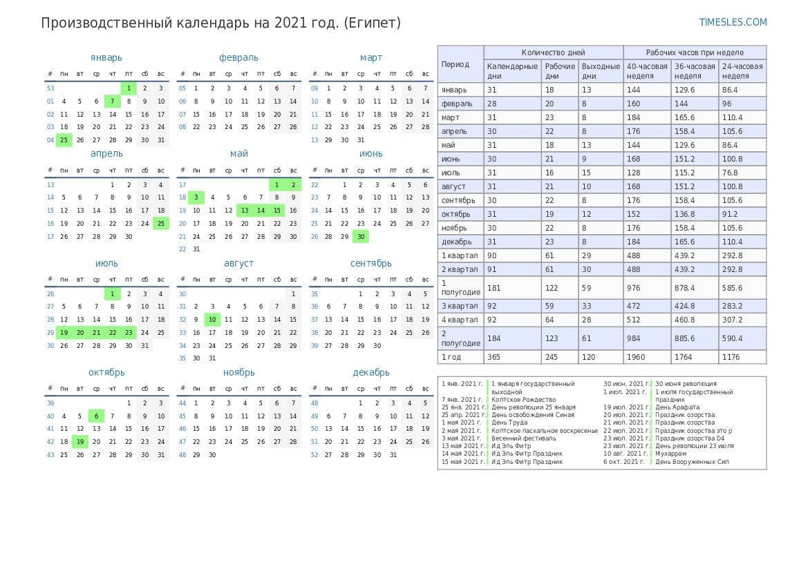 Производственный календарь с праздниками и выходными днями на 4 квартал 2021 года для Египта