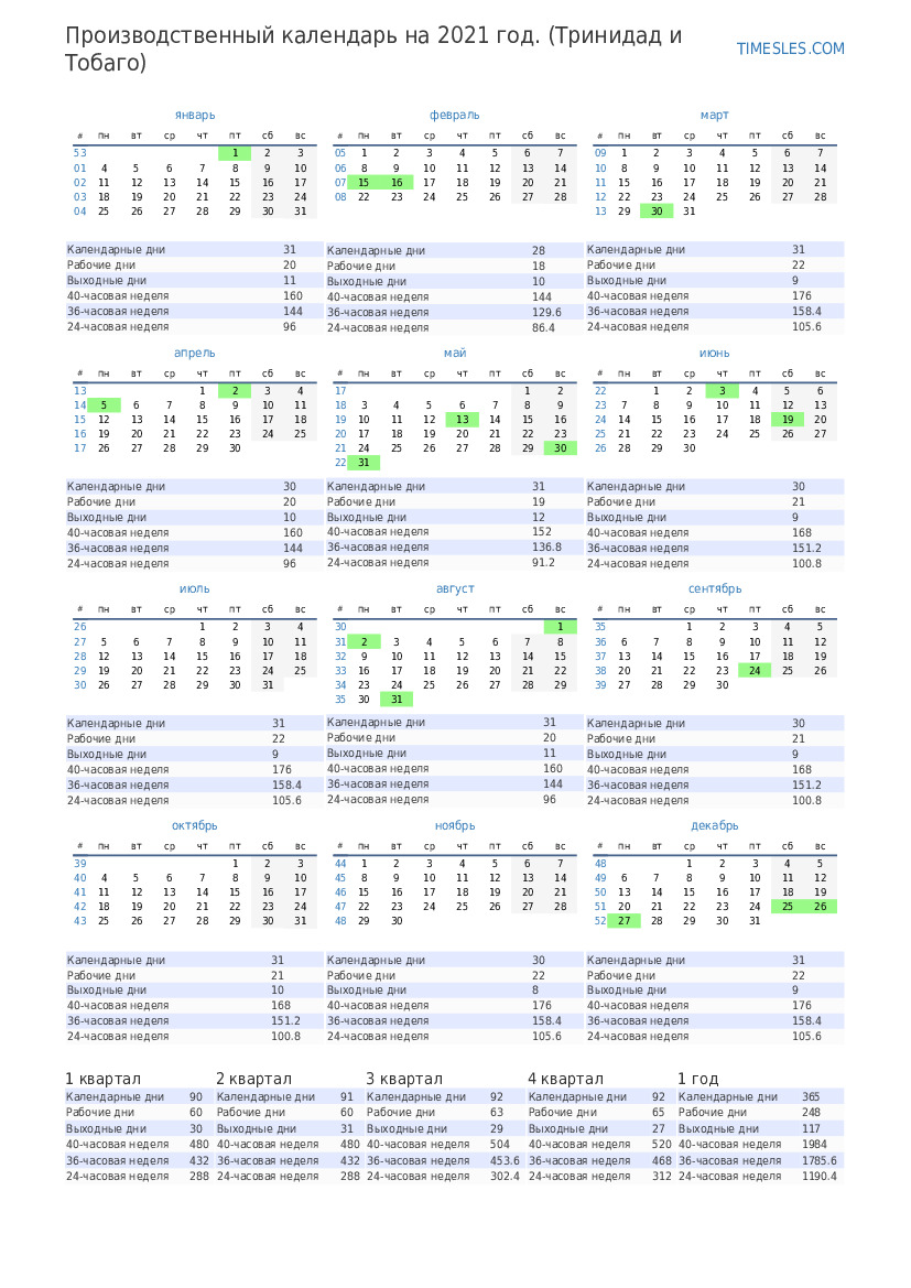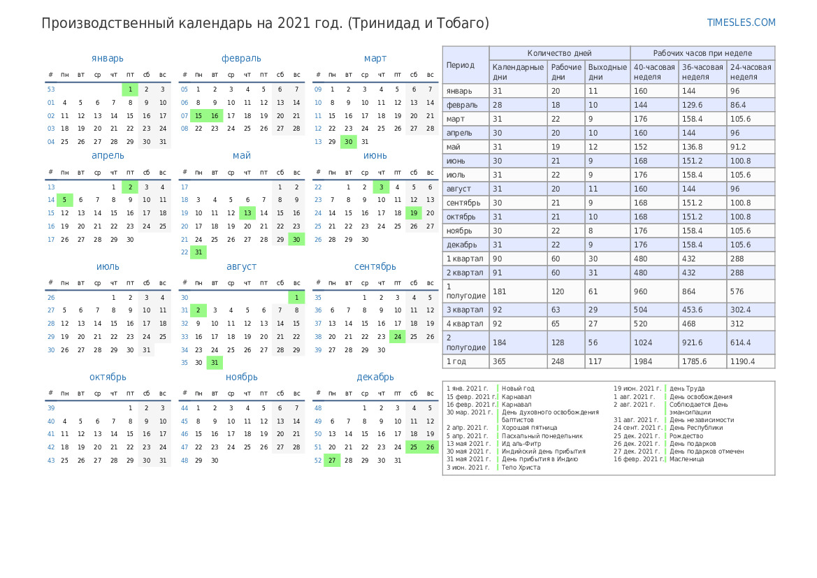 Скачать и распечатать PDF производственный календарь с праздниками и выходными на 4 квартал 2021 года для Тринидада и Тобаго