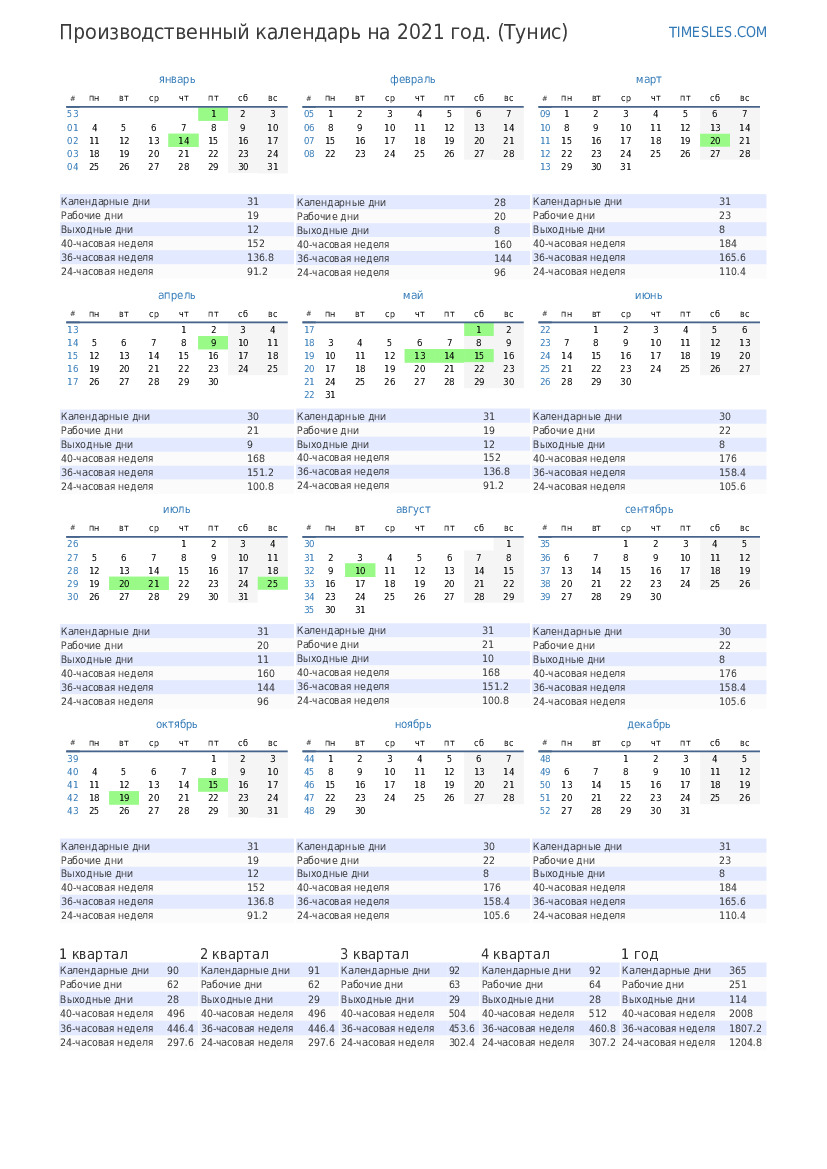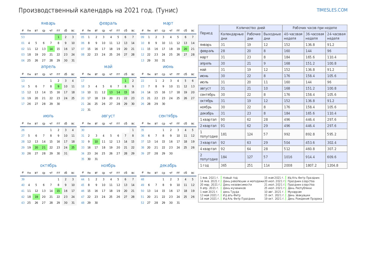 Производственный календарь с праздниками и выходными днями на 4 квартал 2021 года для Туниса