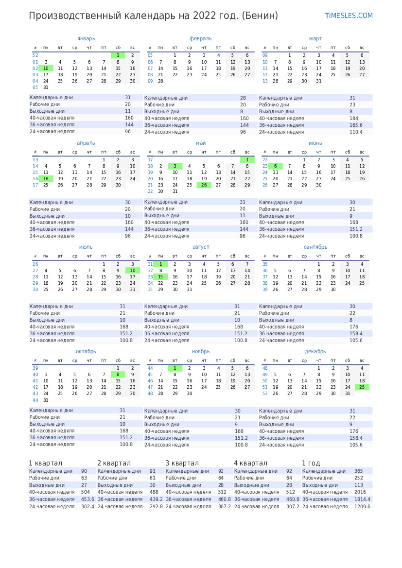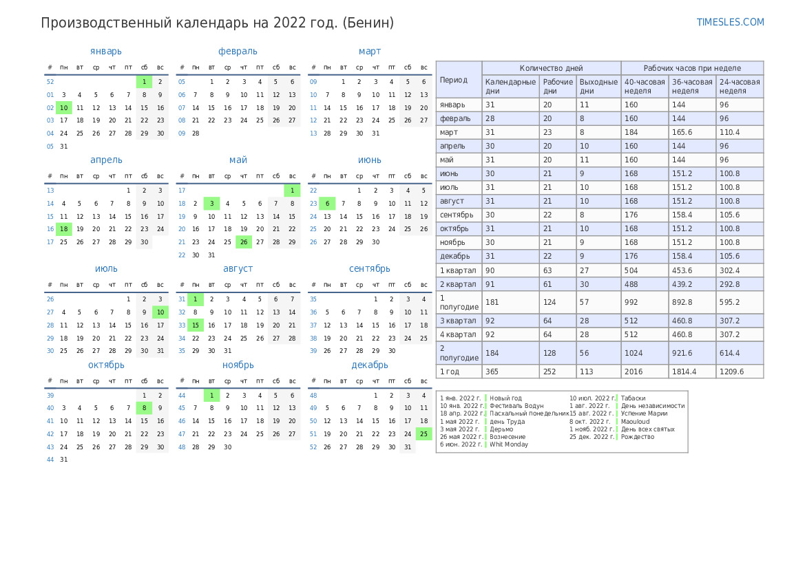 Производственный календарь с праздниками и выходными днями на 1 квартал 2022 года для Бенина