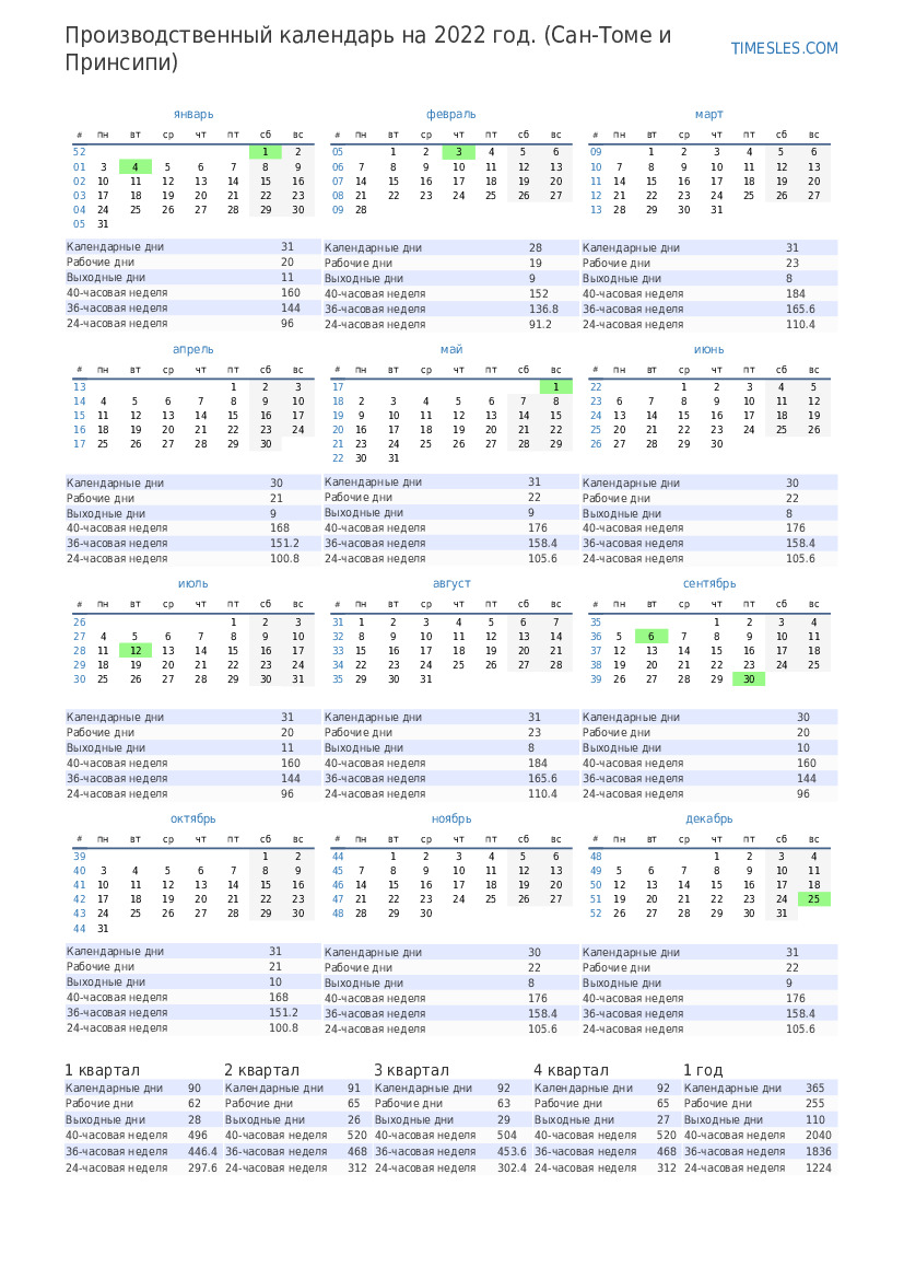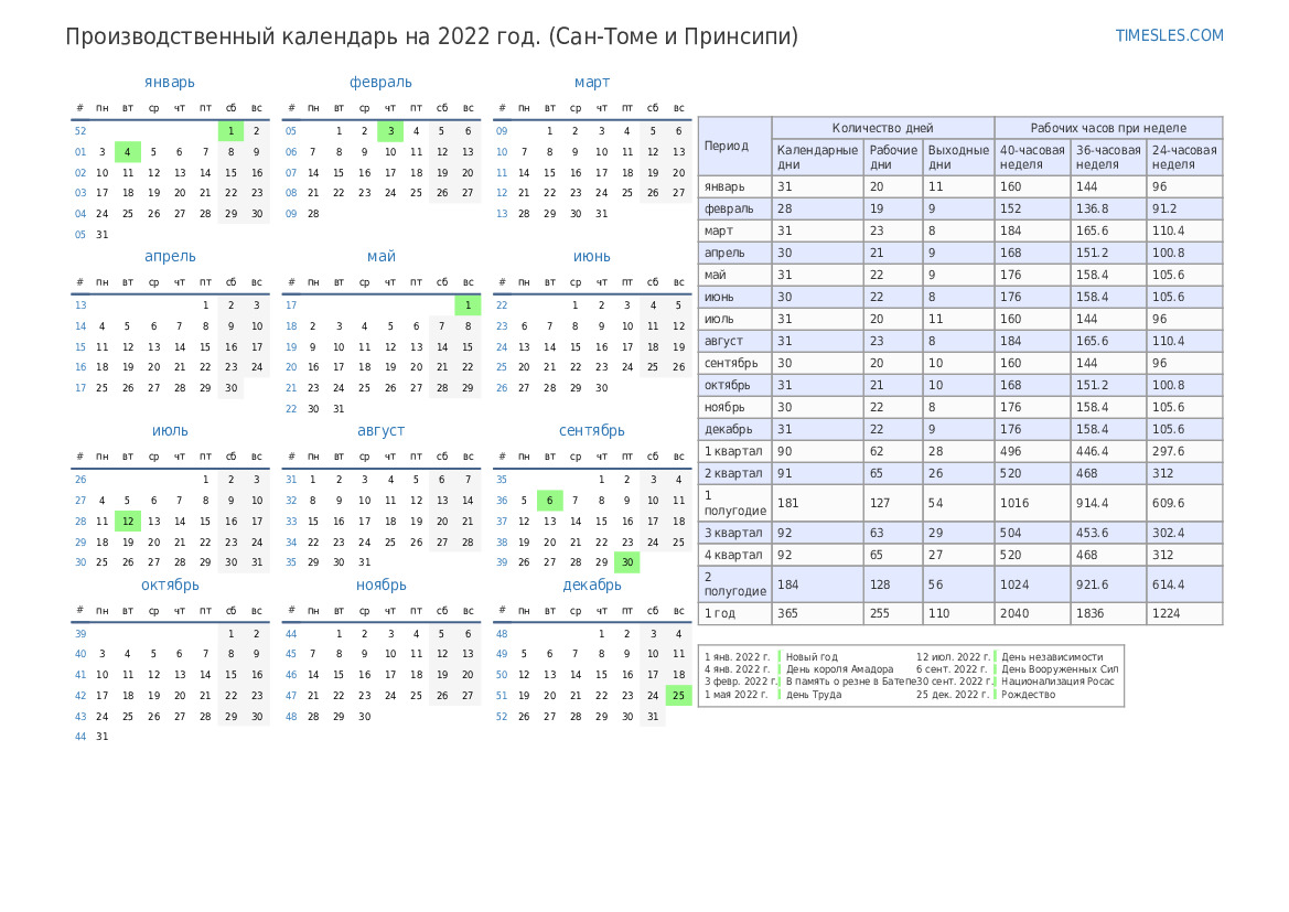 Производственный календарь с праздниками и выходными днями на 4 квартал 2022 года для Сан-Томе и Принсипи