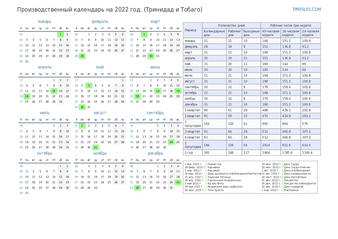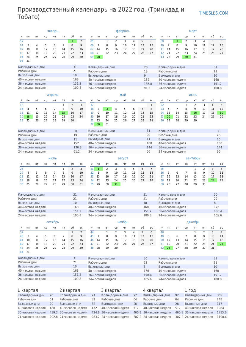 Скачать и распечатать PDF производственный календарь с праздниками и выходными на 4 квартал 2022 года для Тринидада и Тобаго