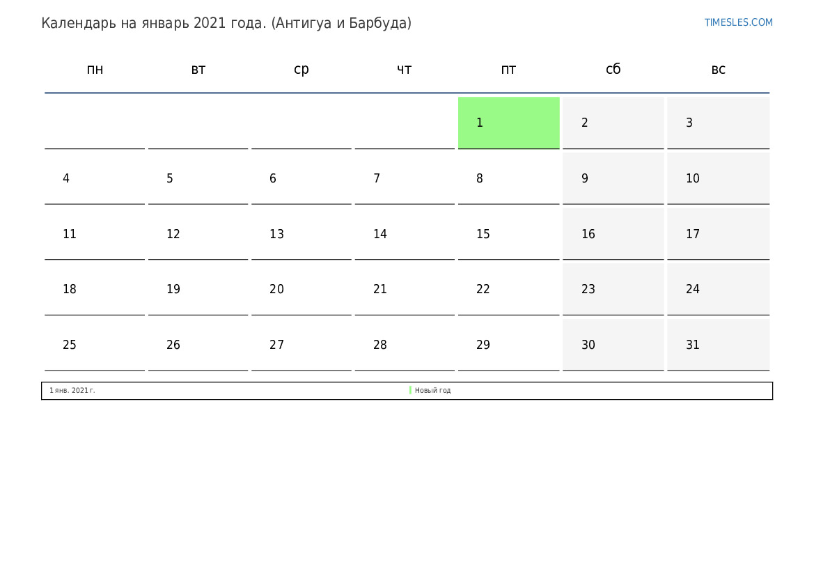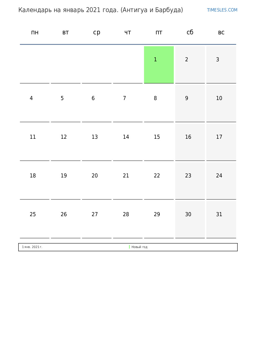 Календарь на январь 2021 года для Антигуа и Барбуды