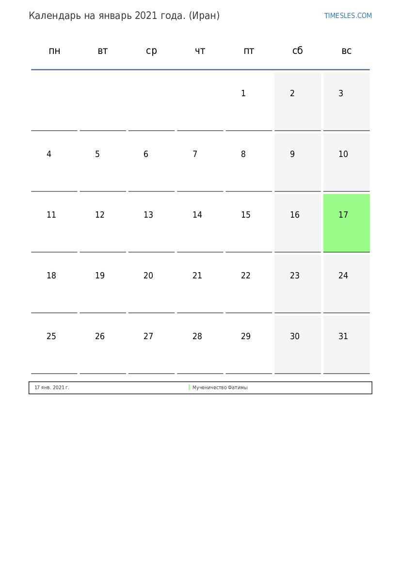 Скачать и распечатать PDF календарь с праздниками и выходными днями на январь 2021 года для Ирана