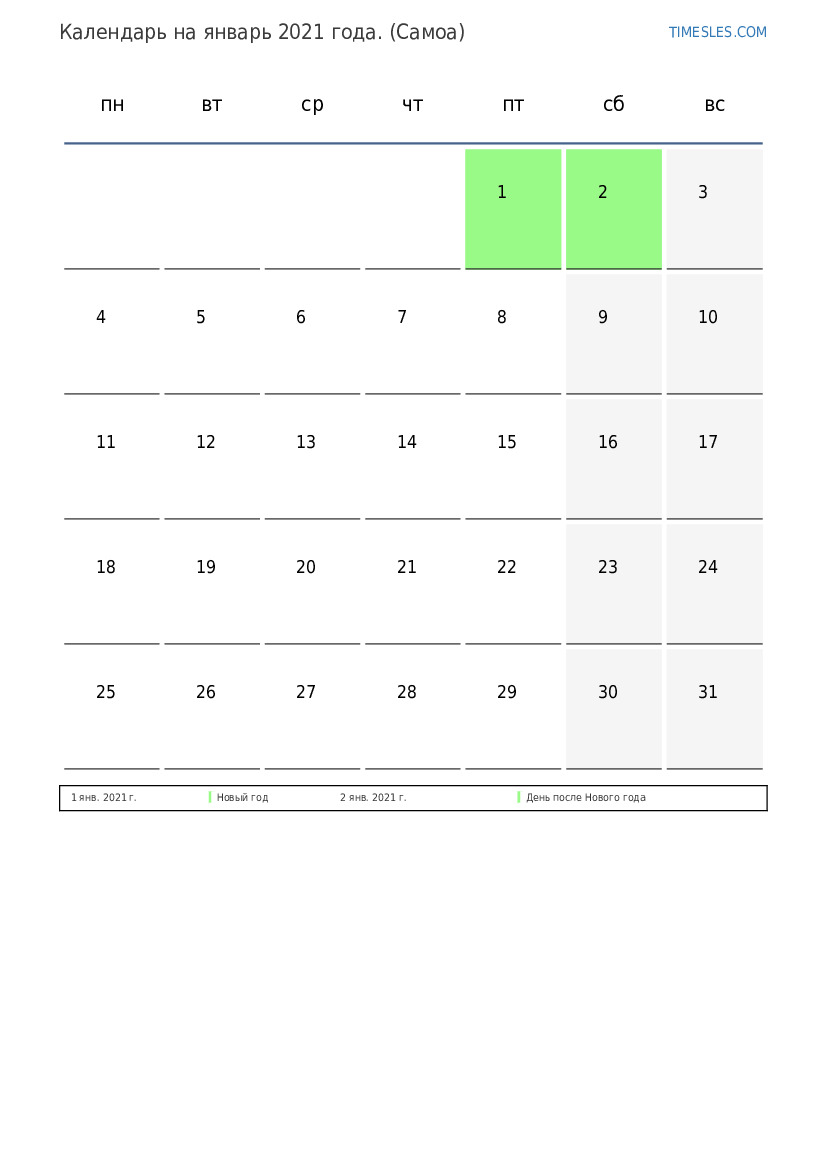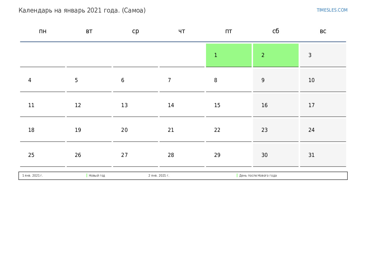 Календарь праздников и выходных дней на январь 2021 года для Самоа