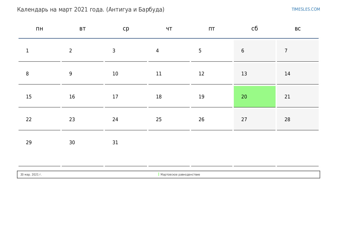 Скачать и распечатать PDF календарь с праздниками и выходными днями на март 2021 года для Антигуа и Барбуды