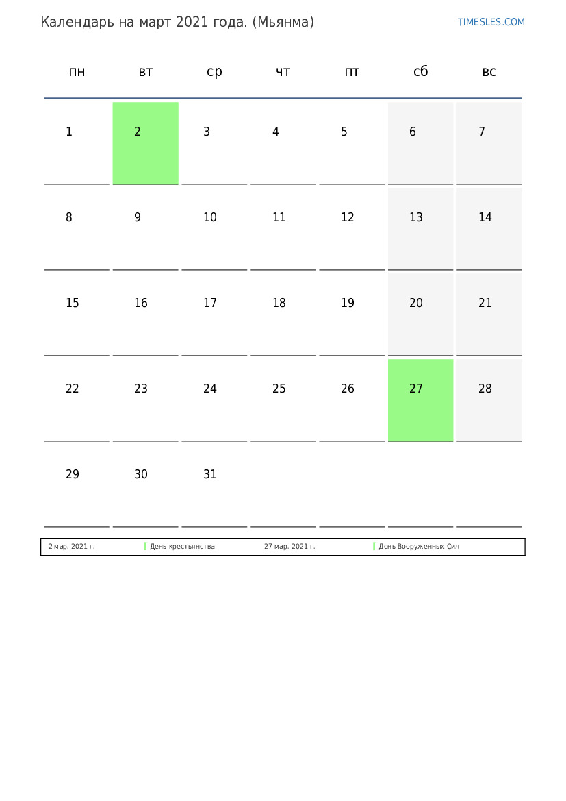 Месяц март содержит 31 день. Это 3 месяц 2021 года. Сезон года: весна. Месяц март начинается в понедельник, и заканчивается в среду. В месяц март 2021 года в Мьянме 3 праздничных и выходных дня.