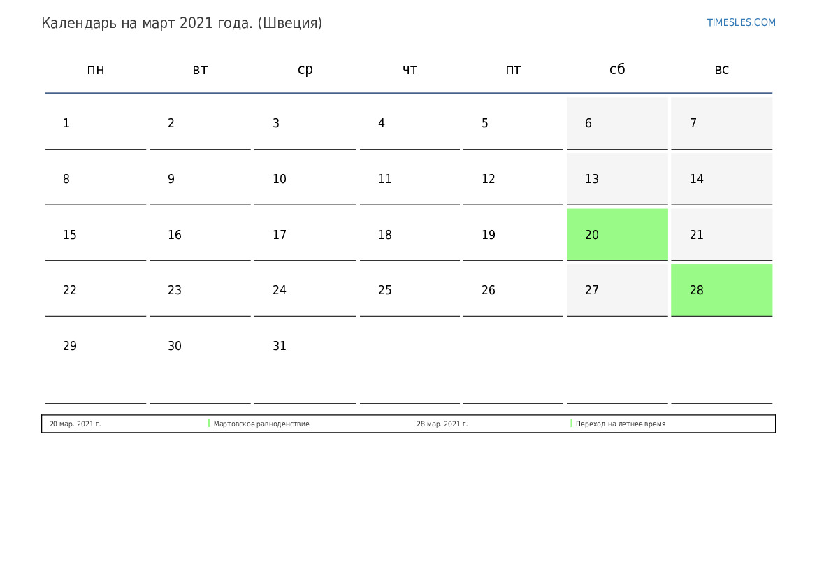 Скачать и распечатать PDF календарь с праздниками и выходными днями на март 2021 года для Швеции