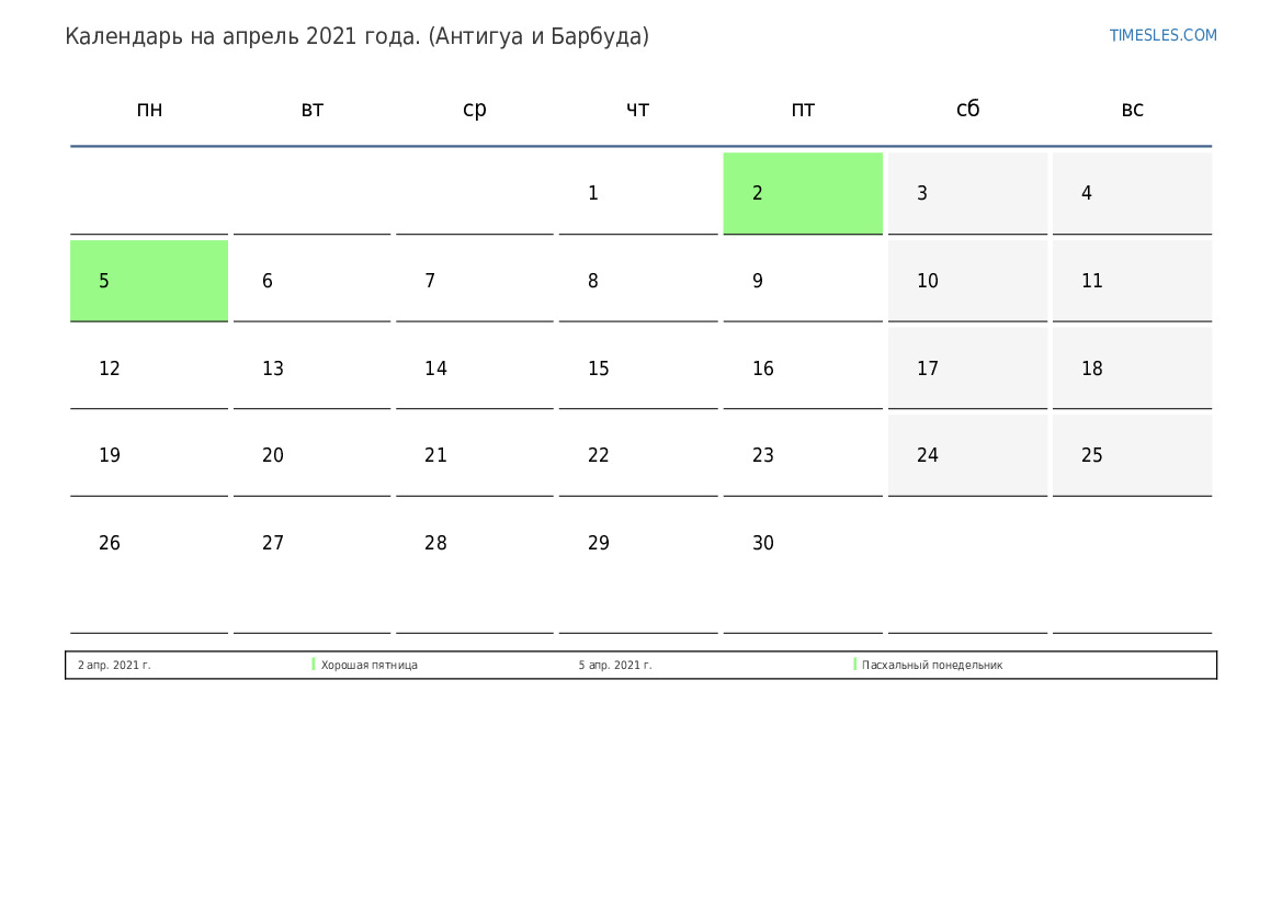 Календарь на апрель 2021 года для Антигуа и Барбуды