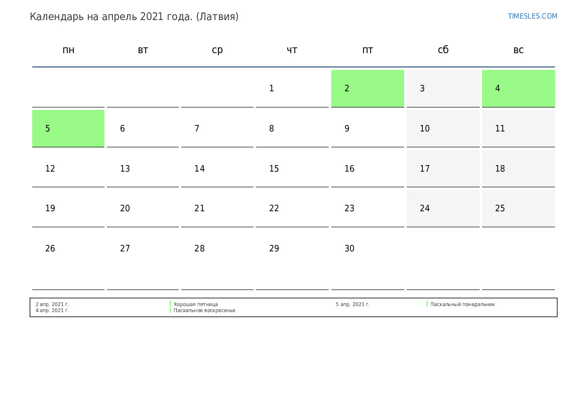 Календарь на апрель 2021 года для Латвии