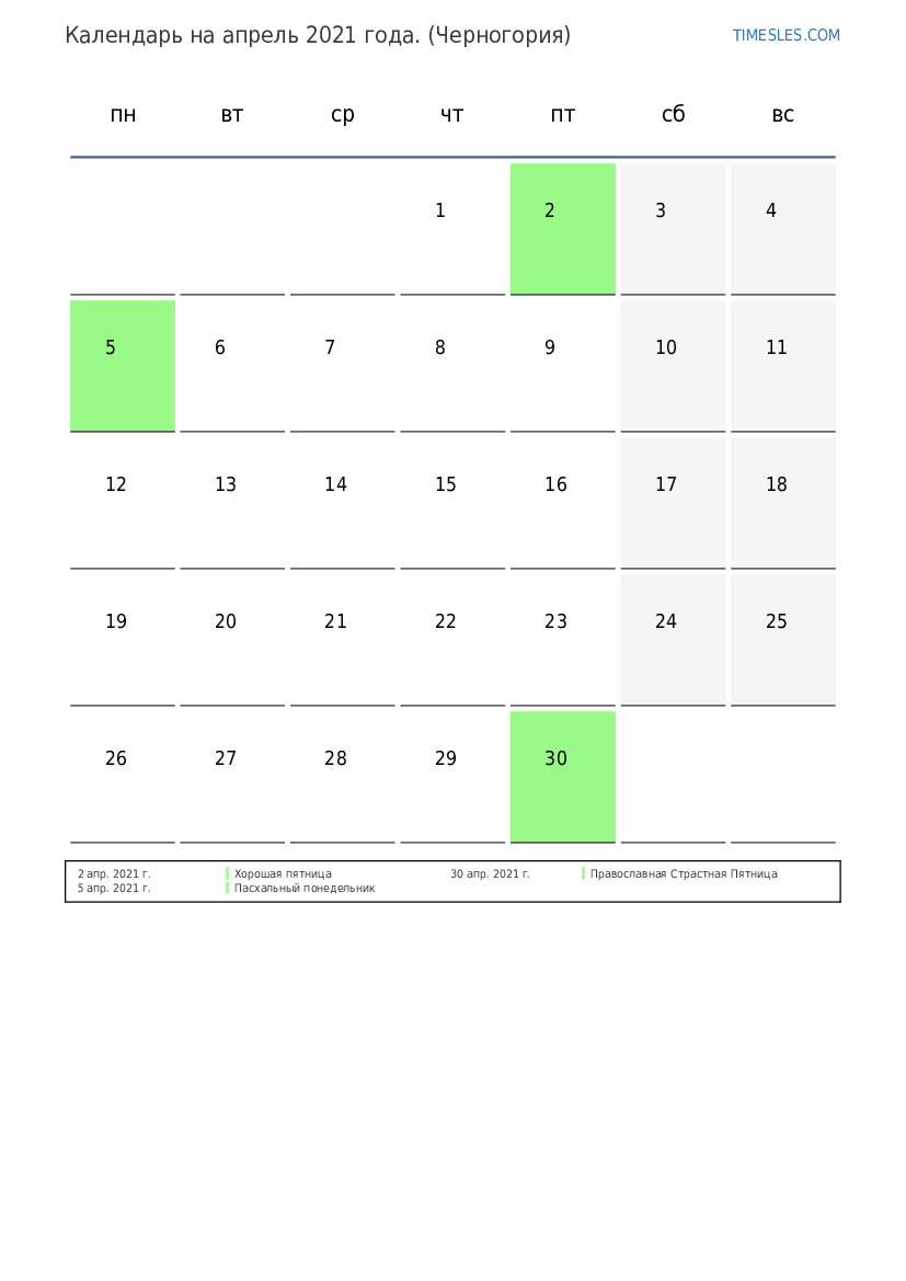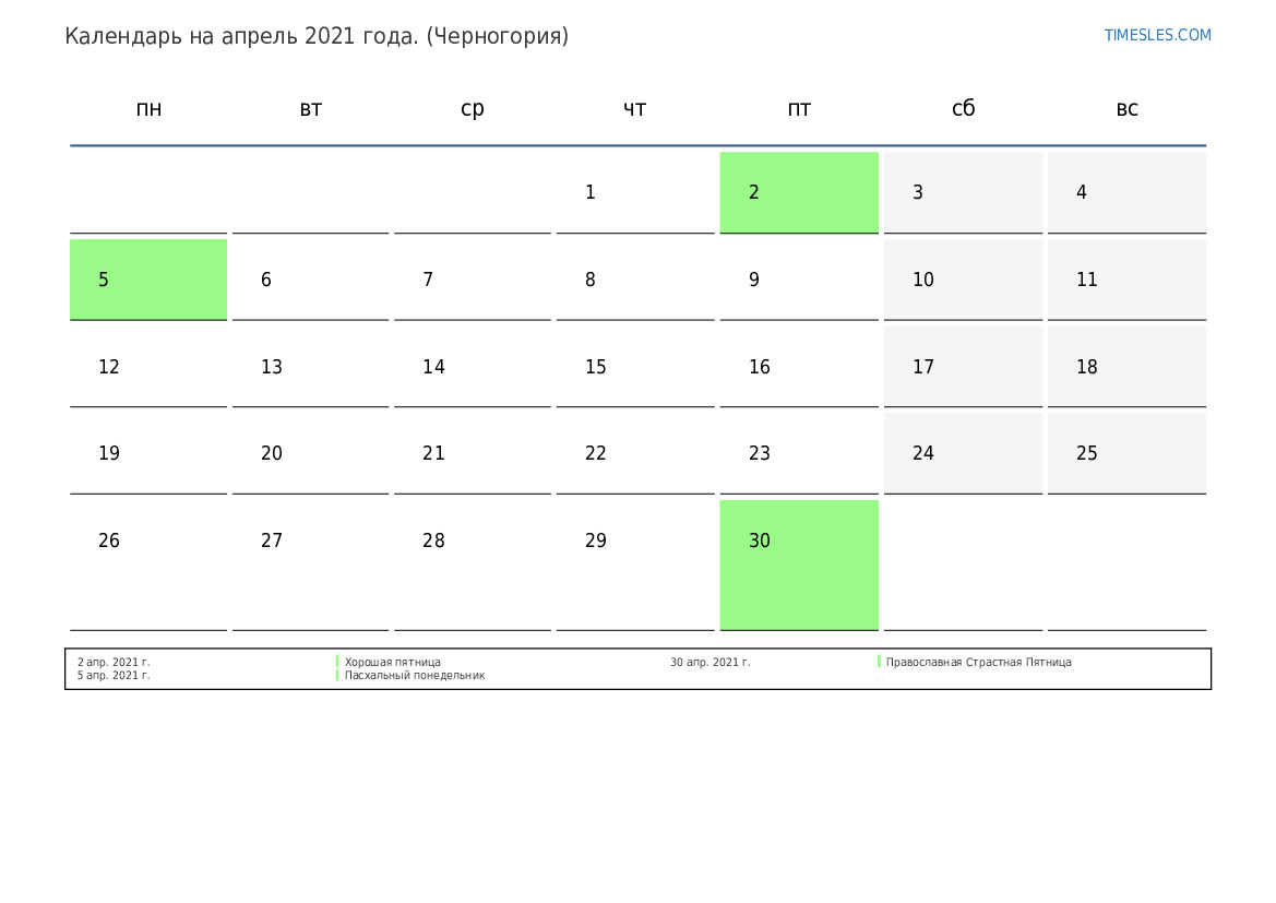 Календарь праздников и выходных дней на апрель 2021 года для Черногории