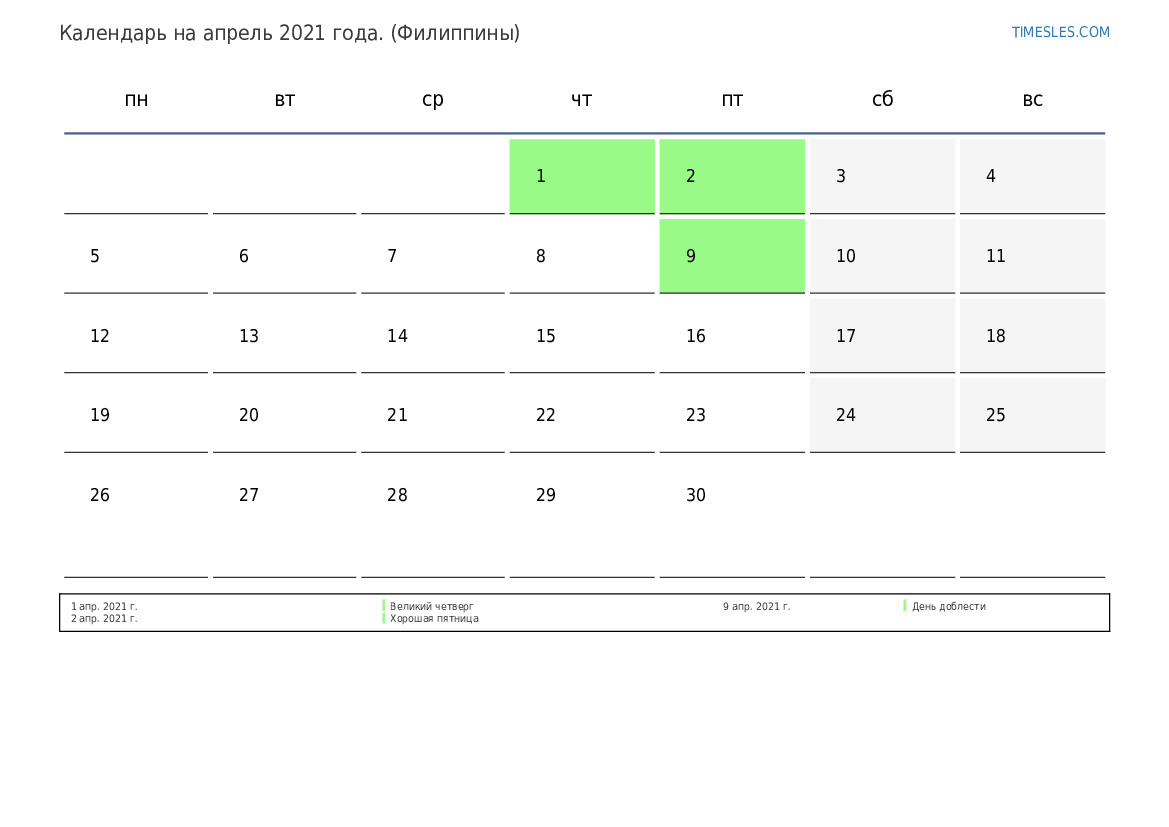 Календарь праздников и выходных дней на апрель 2021 года для Филиппин