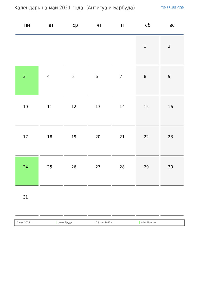Календарь праздников и выходных дней на май 2021 года для Антигуа и Барбуды