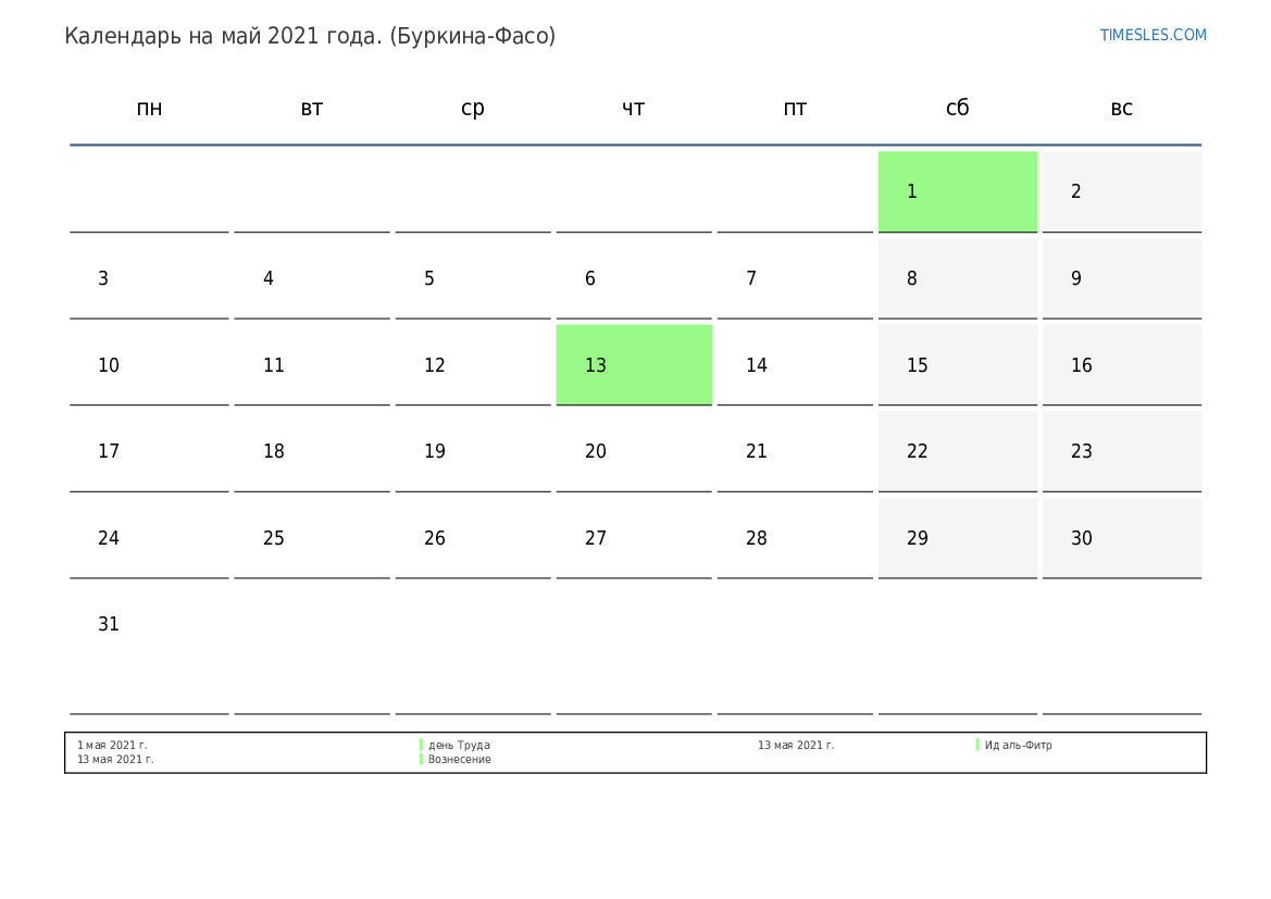 Календарь праздников и выходных дней на май 2021 года для Буркина-Фасо