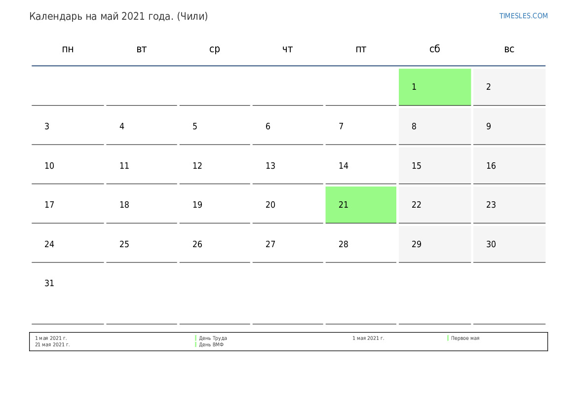 Скачать и распечатать PDF календарь с праздниками и выходными днями на май 2021 года для Чили