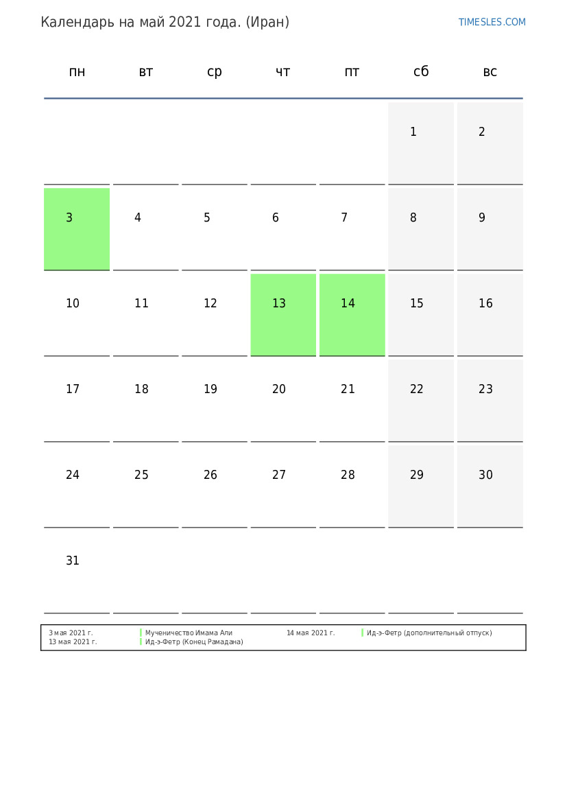 Скачать и распечатать PDF календарь с праздниками и выходными днями на май 2021 года для Ирана
