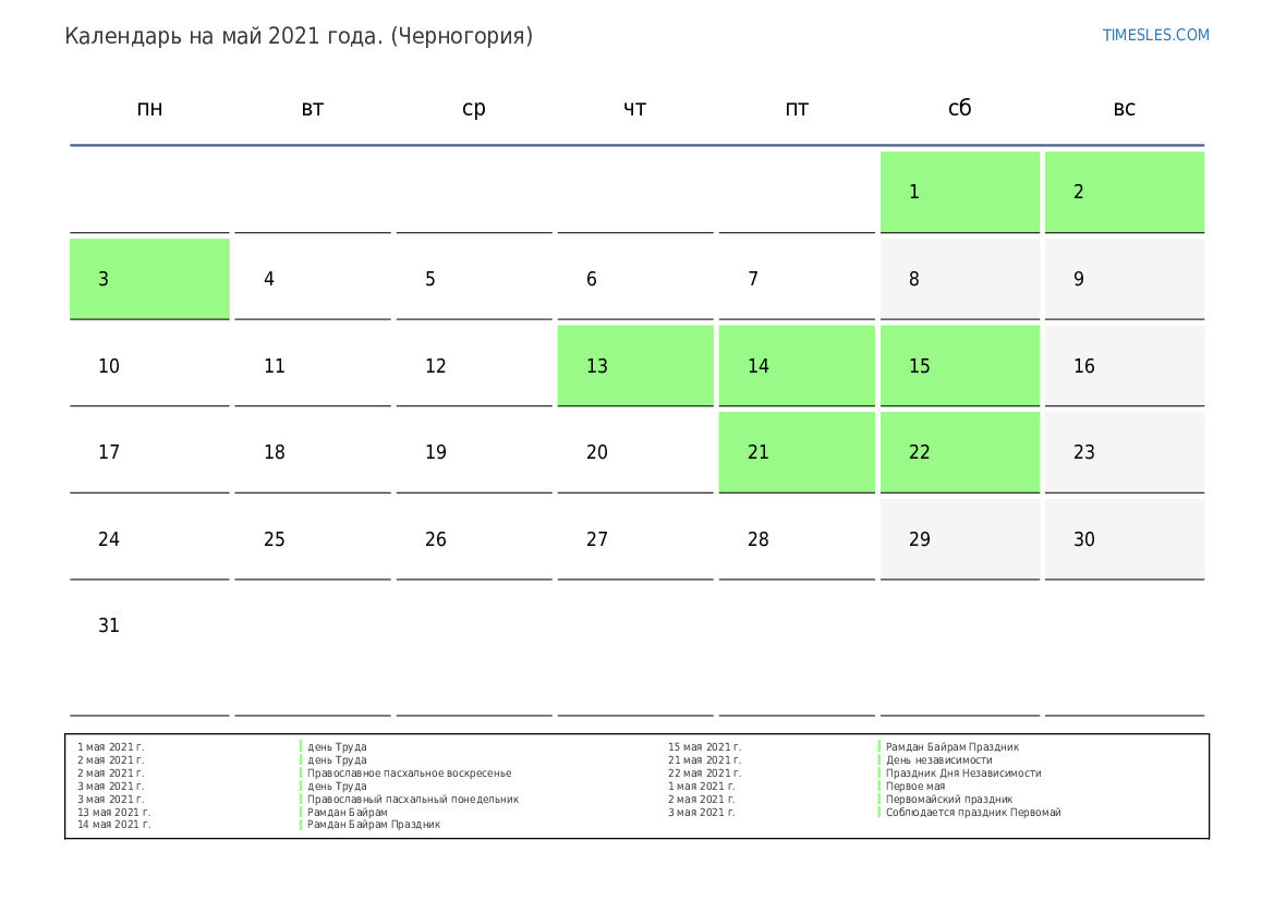 Календарь праздников и выходных дней на май 2021 года для Черногории