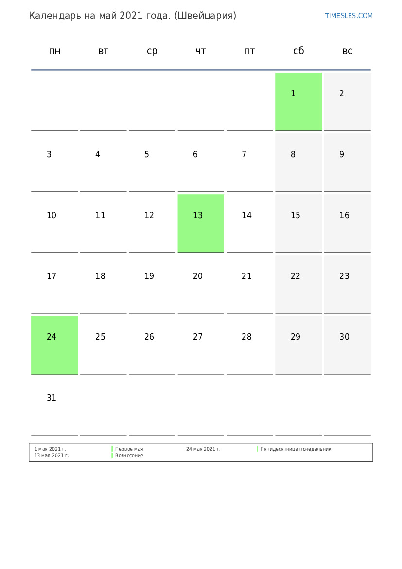Календарь праздников и выходных дней на май 2021 года для Швейцарии