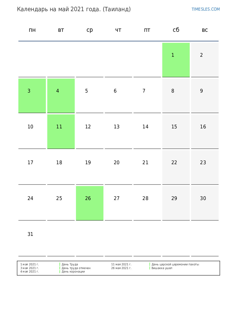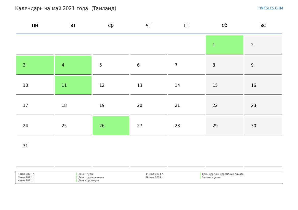 Календарь праздников и выходных дней на май 2021 года для Таиланда