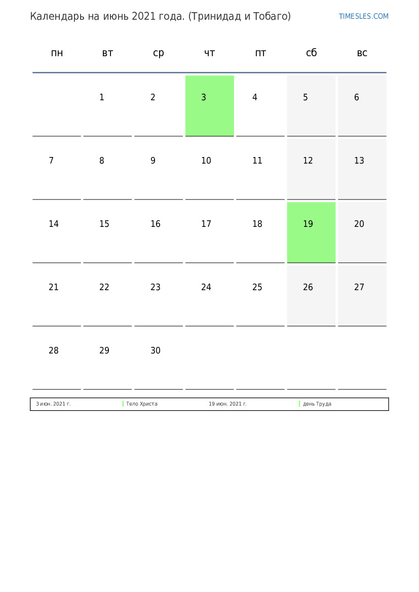 Календарь на июнь 2021 года для Тринидада и Тобаго