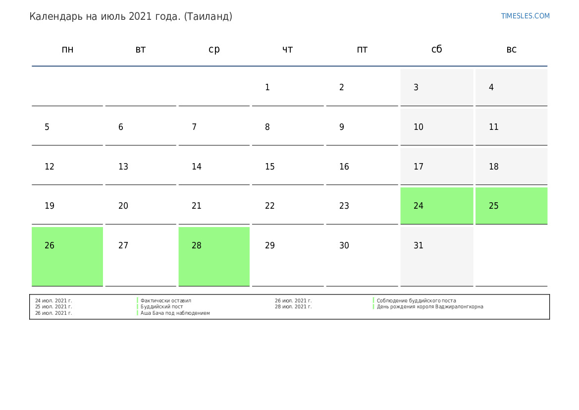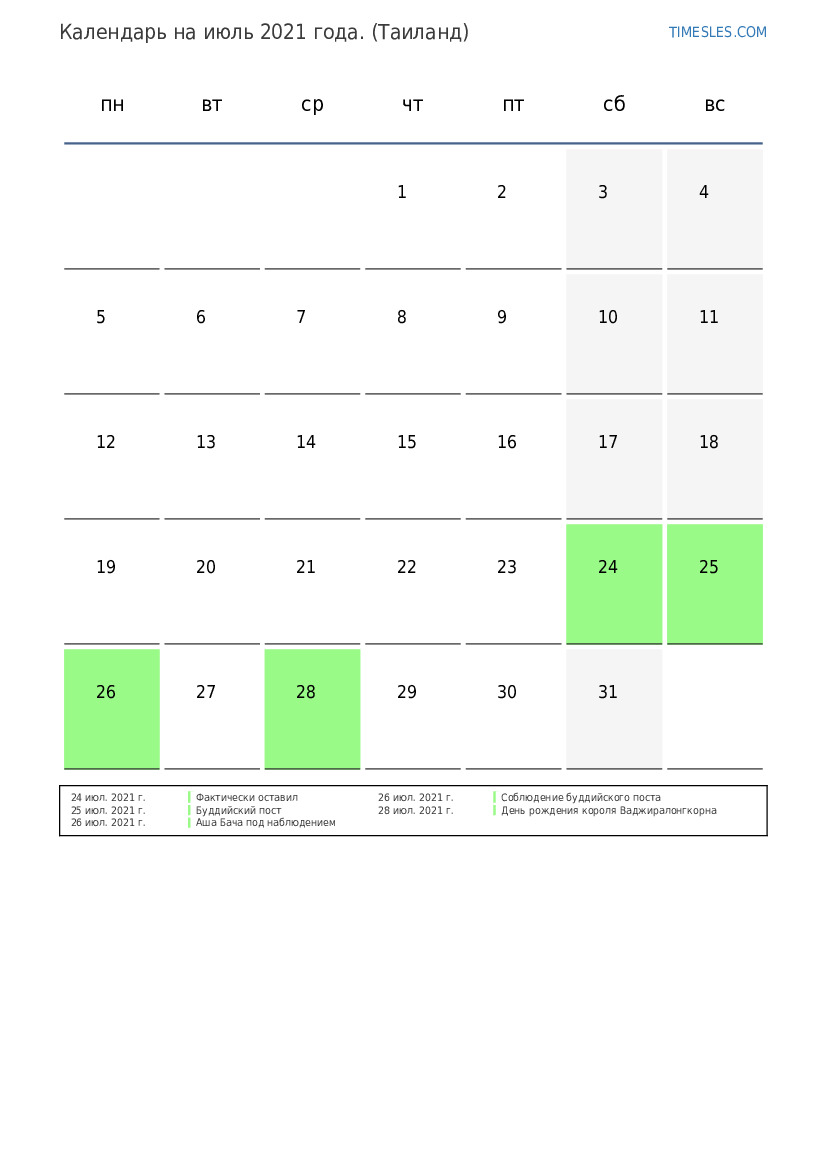 Календарь праздников и выходных дней на июль 2021 года для Таиланда
