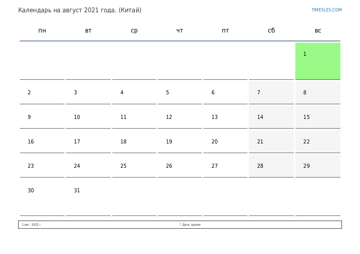Скачать и распечатать PDF календарь с праздниками и выходными днями на август 2021 года для Китая