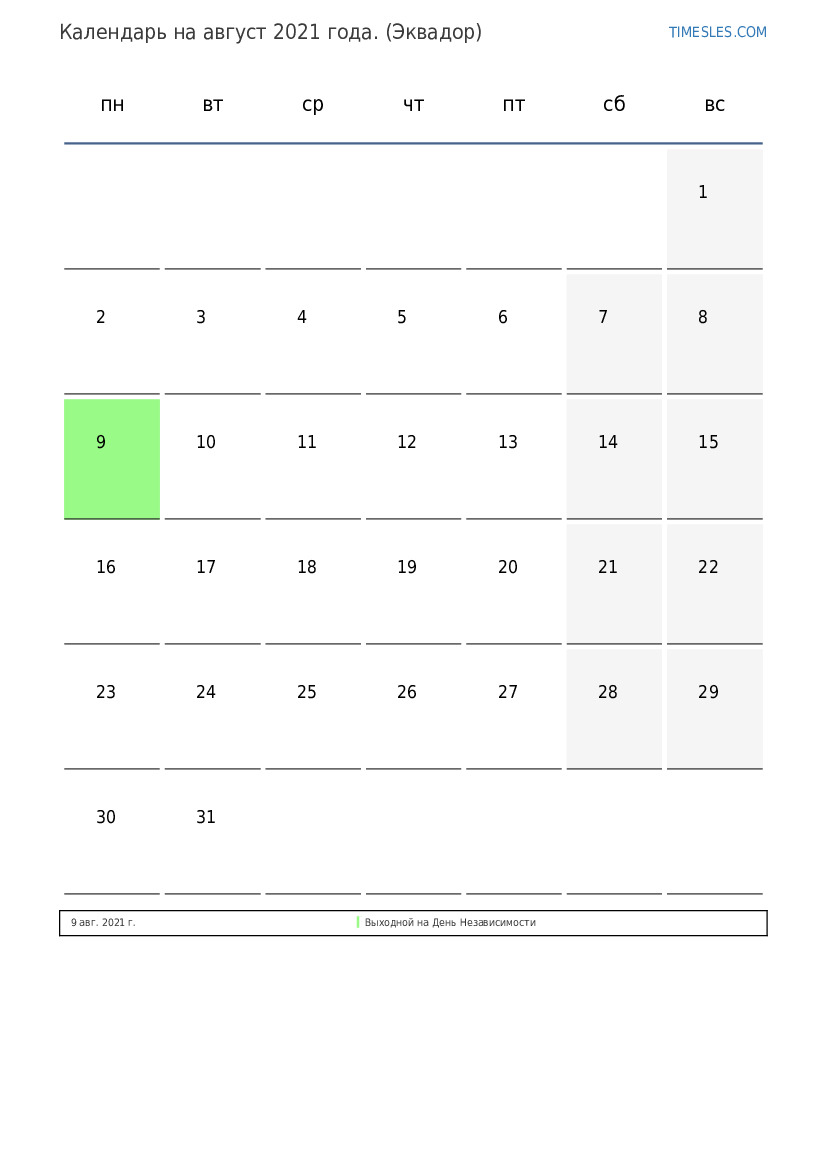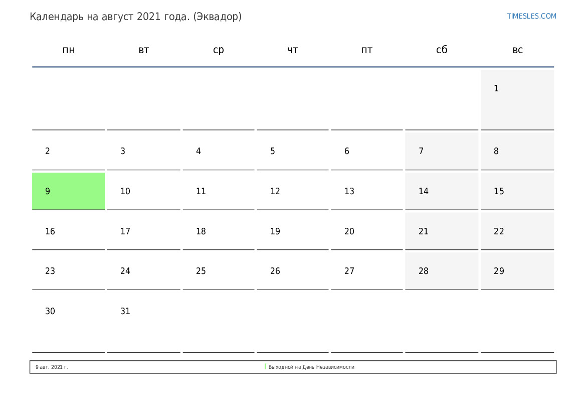 Скачать и распечатать PDF календарь с праздниками и выходными днями на август 2021 года для Эквадора
