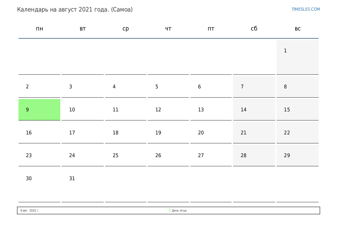 Скачать и распечатать PDF календарь с праздниками и выходными днями на август 2021 года для Самоа